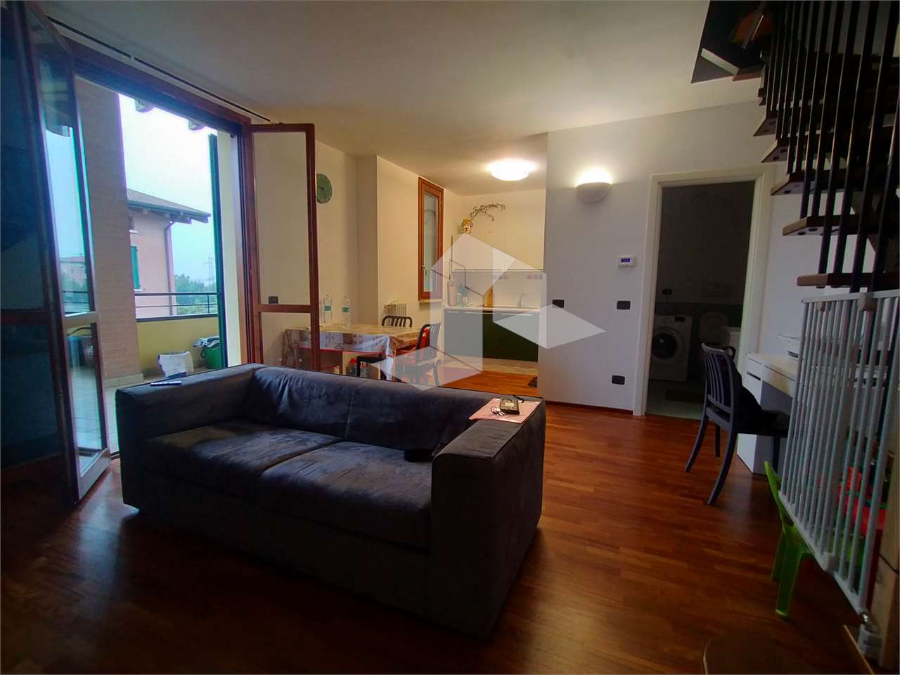Pieve Modolena : In contesto tranquillo e ben abitato si propone un appartamento al secondo e terzo piano tutto arredato con ascensore composto da : ampio salone con angolo cottura bagno e ampio loggiato , mentre al piano superiore camera da letto e bagno ,garage . 750 compreso spese condominiali , libero dal 1 gennaio 2026