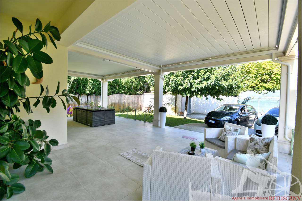 Villa singola disposta su due piani fuori terra oltre all'interrato, con ampio giardino con piscina. Abitazione di circa 570 mq, lotto di circa 1.500 mq, distanza dal mare circa 1.400 metri. Al piano terra: ingresso da porticati, ampio doppio salone, pranzo, cucina abitabile, camera matrimoniale con bagno, bagno di servizio. Al piano primo: due camere matrimoniali con bagno interno, due camere doppie con bagno interno, disimpegno. Al piano interrato con doppio accesso: sala cinema, palestra, lavanderia, camera matrimoniale con bagno, monolocale con bagno per il personale. Con impianti e dotazioni tecnologiche di alto livello.