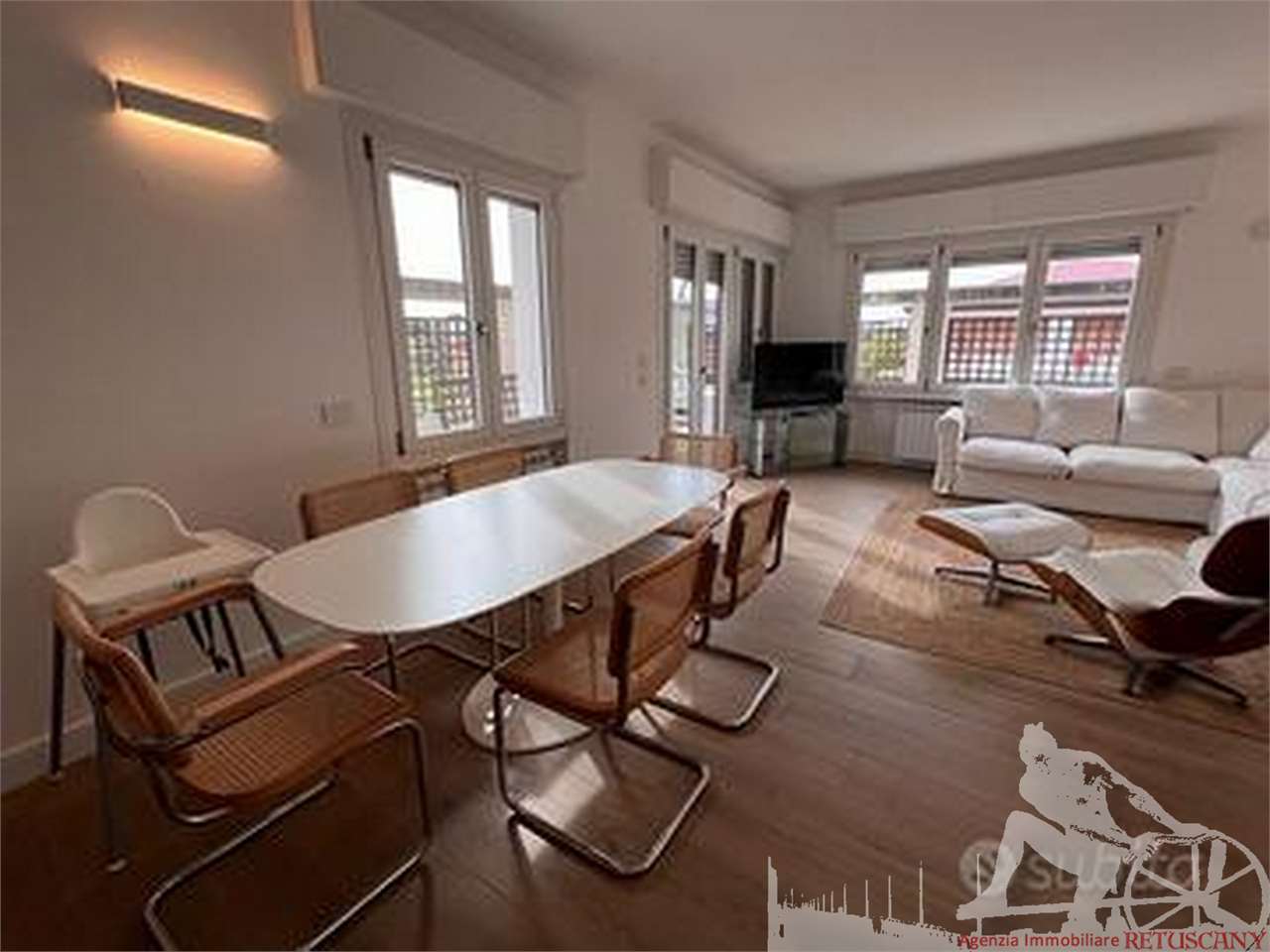 DISPONIBILE PER IL MESE DI AGOSTO - Splendido attico di 150 mq a 400 m dal mare posto al terzo piano con ascensore vista mare e monti, 4 camere (3 matrimoniali, 1 letto francese) 4 bagni, ampio salotto con cucina a vista, aria condizionata in tutte le stanze, 150 mq di terrazza attrezzata con divani prendisole, bbq e tavolo. Posto auto interno.