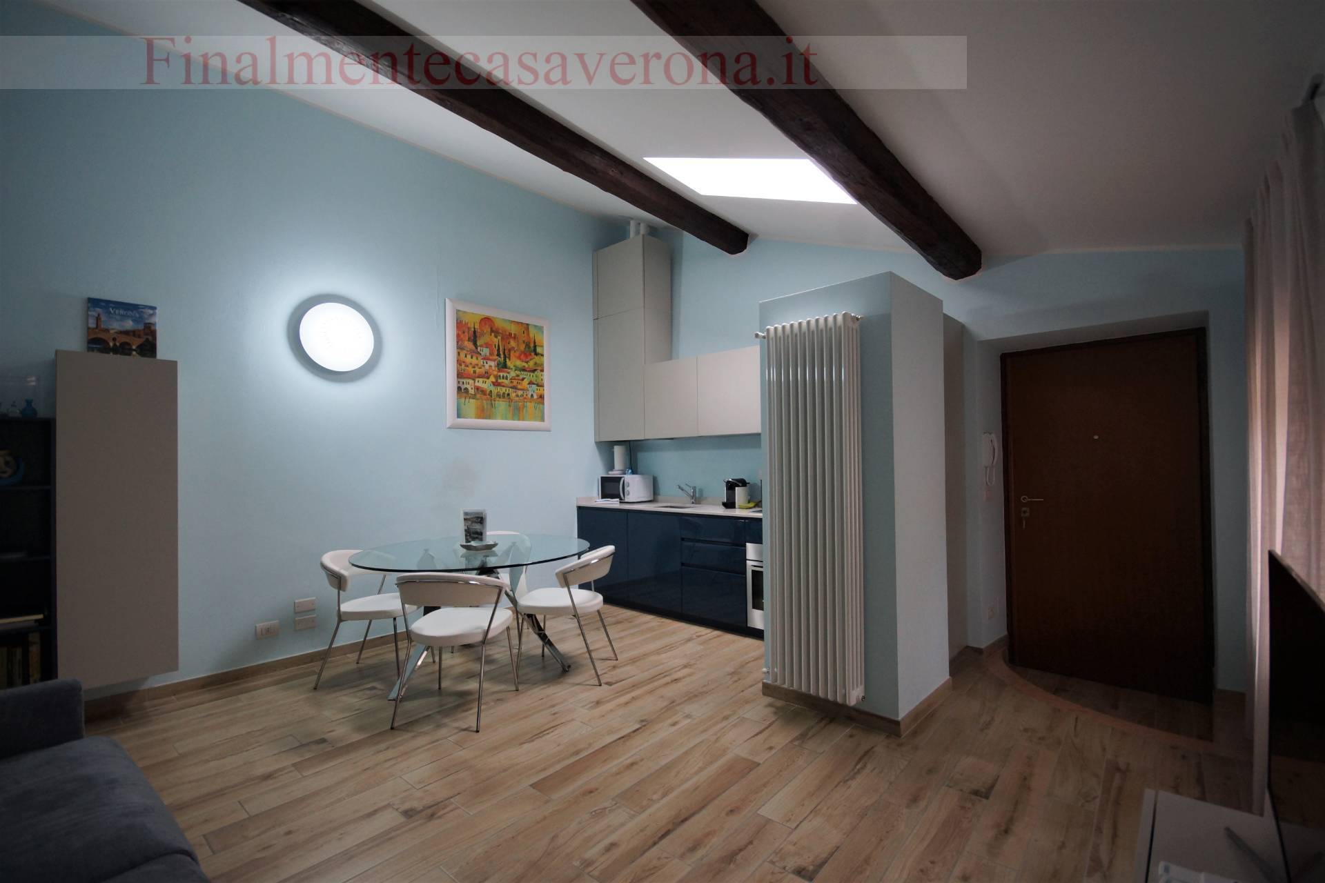 Libero dal <strong>1° settembre 2025</strong>, proponiamo in <strong>affitto transitorio</strong> un affascinante appartamento situato nel <strong>cuore del centro storico di Verona</strong>, in una zona intrisa di storia e fascino, a pochi passi dalle principali attrazioni della città. Questo immobile è <strong>ideale per specializzandi, medici, professionisti in trasferta o aziende</strong> che cercano soluzioni abitative temporanee. Si trova in <strong>zona a traffico limitato (ZTL)</strong>, con parcheggio a pagamento disponibile a circa 700 metri.<br>L'immobile, di circa <strong>60 mq commerciali</strong>, si trova al <strong>secondo e ultimo piano (senza ascensore)</strong> di una palazzina signorile in impeccabili condizioni, recentemente ristrutturata nelle parti comuni. Perfetto per una coppia o un single che desidera vivere un'esperienza autentica nel cuore della città, l'appartamento è composto da <strong>due locali ben distribuiti</strong>: una luminosa camera da letto, un bagno moderno con doccia e un'accogliente <strong>cucina a vista completamente attrezzata</strong>, ideale per preparare i pasti e trascorrere piacevoli momenti conviviali.<br>Gli ambienti interni, anch'essi oggetto di una recente e accurata ristrutturazione, godono di ottima luminosità e aerazione grazie alle ampie finestre con infissi in vetrocamera, che garantiscono un'eccellente insonorizzazione e un ottimo isolamento termico. L'arredamento è <strong>moderno, di alta qualità e curato nei minimi dettagli</strong>, fornito di ogni comfort necessario per rendere la vita quotidiana più piacevole e comoda.<br>Il riscaldamento è autonomo a metano e l'appartamento è dotato anche di <strong>pompe di calore caldo/freddo</strong>, assicurando un comfort ottimale in ogni stagione e un'ottima efficienza energetica. Le <strong>spese complessive</strong>, comprensive di condominiali, utenze, TARI, Wi-Fi e pulizia caldaia, ammontano a circa <strong>290 euro mensili</strong>.<br><strong>Attenzione: questa locazione è esclusivamente per finalità abitative transitorie e non sono ammesse locazioni turistiche.</strong><br>Non perdere l'opportunità di vivere in un appartamento unico e ricco di charme, in una delle zone più ambite di Verona! Contattaci per organizzare una visita, previo accordo telefonico.