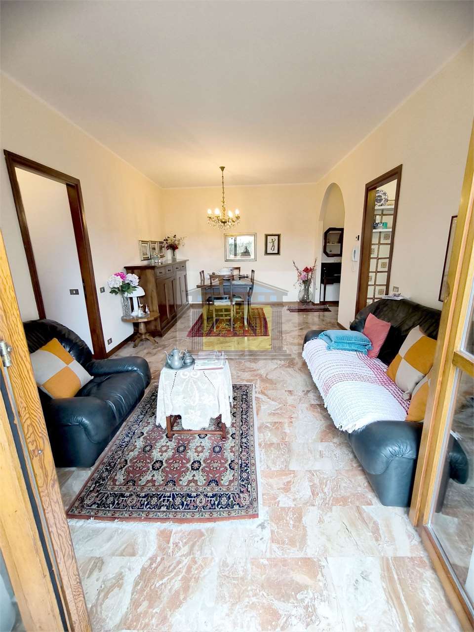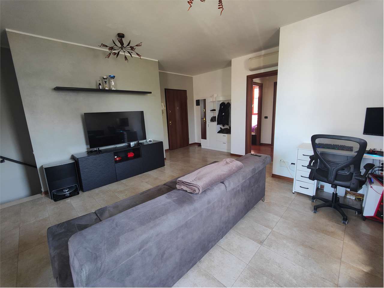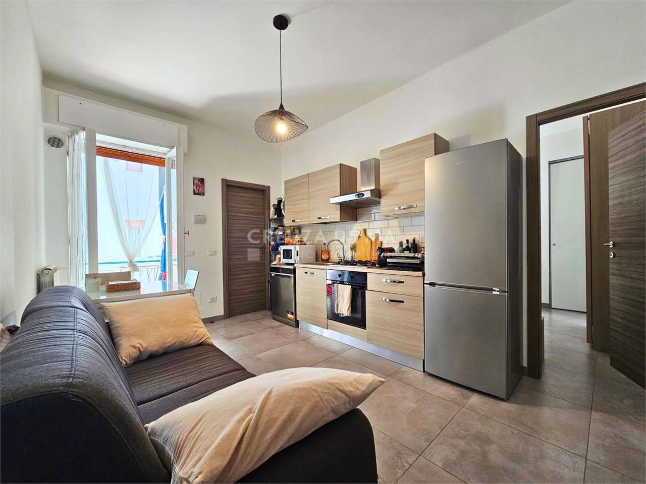 A pochi passi dal mercato comunale e dalla Scuola SantAgostino, in un piccolo stabile ben tenuto, appartamento di circa 85 mq al primo piano, pronto da abitare senza lavori. La zona giorno si apre con un ingresso indipendente dotato di spazio guardaroba, prosegue con un soggiorno doppio organizzato in area pranzo e zona living, e si affaccia su un balcone panoramico. La cucina, di dimensioni pratiche, si presta allinstallazione di un tavolo a scomparsa per pasti veloci, mantenendo il soggiorno come vero spazio di convivenza. La zona notte è separata e riservata: camera matrimoniale con balcone, seconda camera doppia e bagno recentemente ristrutturato con doccia, sanitari sospesi e vano per la lavatrice. Limmobile è in ordine perfetto, dotato di infissi a doppio vetro, porta blindata e riscaldamento autonomo. Completa la proprietà una cantina e unampia autorimessa singola, raggiungibile con ascensore e dotata di accesso pianeggiante, ideale per auto familiare e moto.