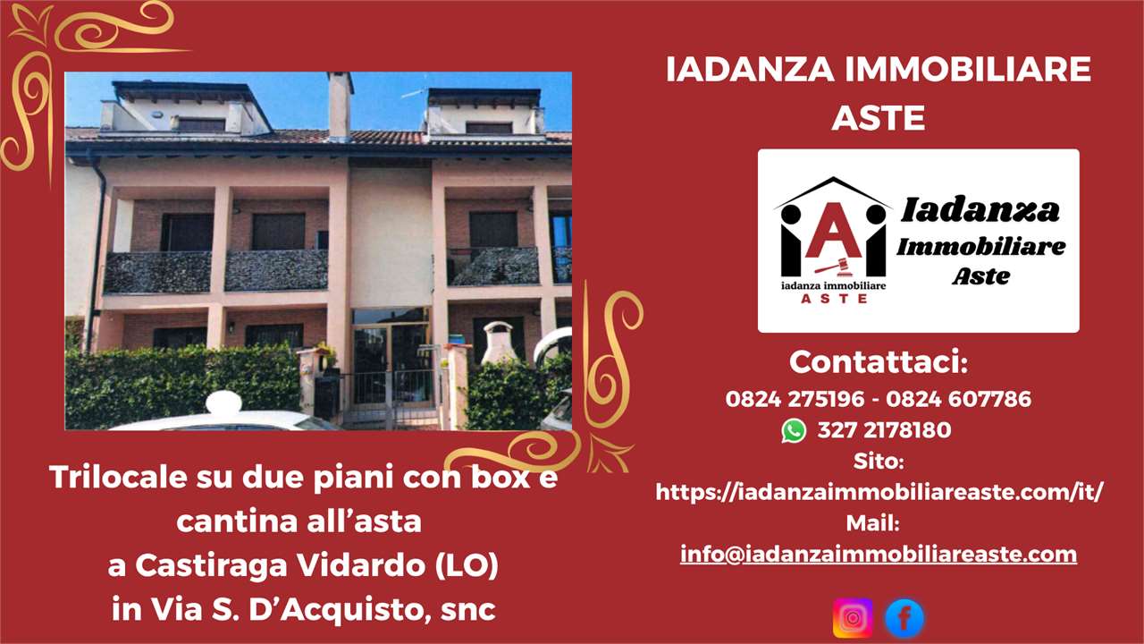 Codice Annuncio: V000983 Offerta Minima: 74.748,75 Prezzo Base: 99.665,00 Valore di Perizia: 125.900,00 Data e Ora dellAsta: 17/06/2026 09:15 Termine presentazione offerte: 15/06/2026 03:00 Trilocale su due piani con box e cantina allasta a Castrigana Vidardo (LO), in Via Salvo DAcquisto. Limmobile è ubicato nel Comune di Castrigana Vidardo, in una zona residenziale periferica caratterizzata da tranquillità e bassa densità abitativa. L'unità abitativa è inserita in un contesto residenziale tranquillo e si sviluppa su due livelli collegati da scala interna. Al piano terra troviamo un luminoso soggiorno con angolo cottura, una camera da letto, un bagno e un balcone; al piano superiore è presente una seconda camera con ulteriore bagno, garantendo una buona distribuzione degli spazi e funzionalità abitativa. Completano la proprietà un box auto e una cantina al piano interrato, elementi molto richiesti e che aumentano il valore complessivo dellimmobile. Per maggiori dettagli, documentazione completa o foto aggiuntive, visita il nostro Sito ufficiale o chiamaci. NOTE IMPORTANTI -Le informazioni, immagini e geolocalizzazione sono indicative e non costituiscono elemento contrattuale. -La documentazione ufficiale della procedura è lunico riferimento valido ai fini legali. -Si consiglia unattenta analisi tecnica e legale prima della partecipazione. Se hai bisogno di informazioni in modo rapido e senza impegno ti basterà chiamarci o scriverci tramite il nostro Sito Iadanza Aste Consulenza specializzata in immobili allasta su tutto il territorio nazionale. È possibile inoltre richiedere sopralluoghi tramite i recapiti dello Studio. -IADANZA ASTE- ////////////////////////////////SCOPRI LA DIFFERENZA////////////////////////// Perché sceglierci? Perché di noi ti puoi fidare ! Garantiamo assistenza completa per lacquisto di immobili allasta, con un approccio professionale, trasparente e orientato esclusivamente allinteresse dellacquirente. Cerca su Google Iadanza Immobiliare Aste per accedere a tutti i dettagli e richiedere assistenza gratuita. Vantaggi per chi vorrà avvalersi della nostra collaborazione : - Prima Consulenza gratuita e senza impegno - Analisi preventiva tecnico-legale - Supporto completo in tutte le fasi - Assistenza finanziaria personalizzata - Gestione operativa dellintero processo di acquisizione Servizi inclusi - Analisi documentale con professionisti dedicati - Supporto durante visite e verifiche - Assistenza nelle pratiche e nelle procedure - Affiancamento fino alla conclusione delloperazione Rif. Annuncio: 25TR101