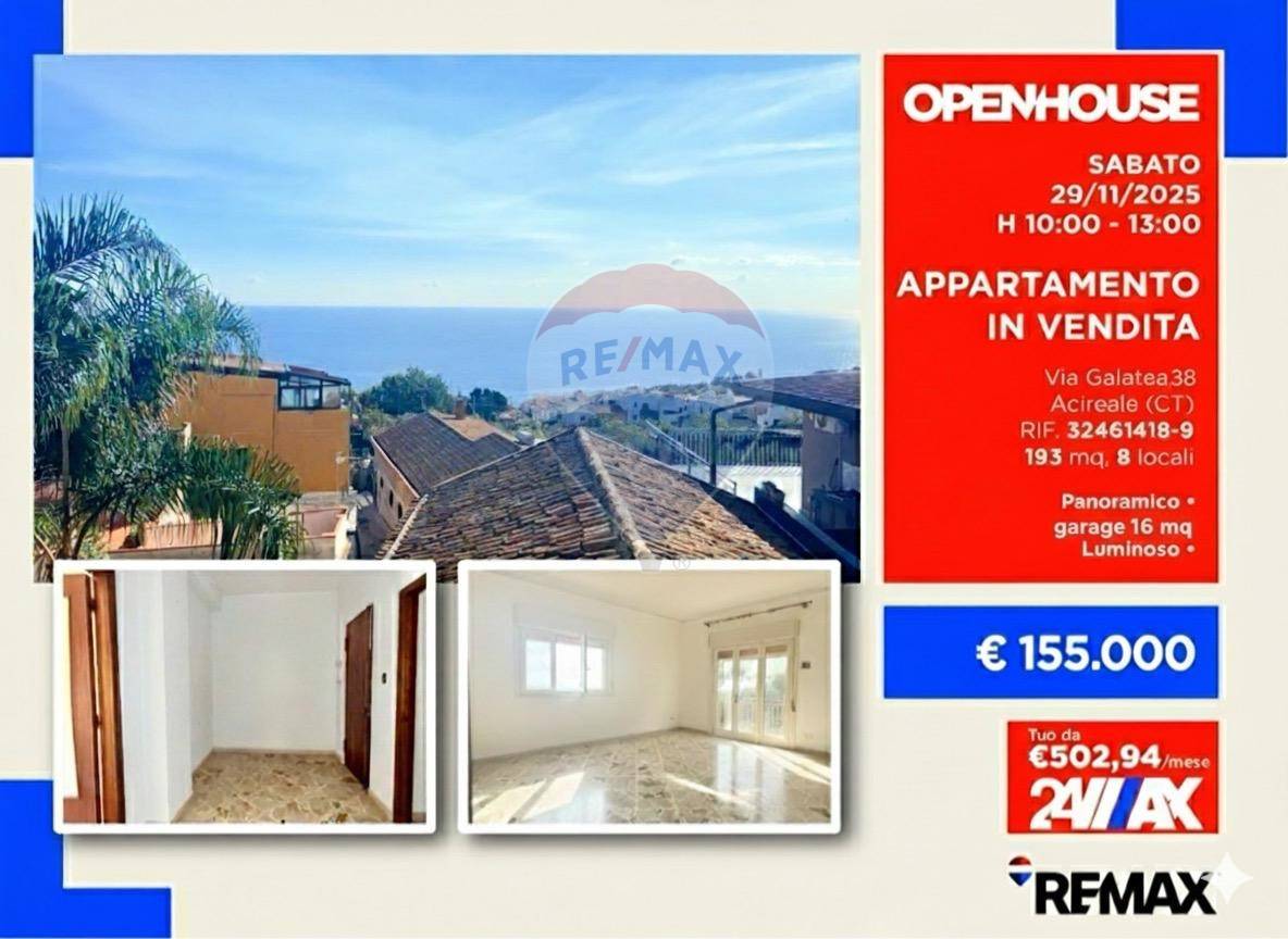 Esclusivamente per il giorno dell'open house, Remax propone in vendita un grande e luminoso appartamento ad Acireale in via Galatea 38, situato in una posizione centrale, una zona residenziale tranquilla ma al tempo stesso vicina ai principali servizi della città. L’immobile è libero al rogito, quindi immediatamente disponibile Costruito nel 1970, l’appartamento è stato oggetto di continue ristrutturazioni e manutenzioni nel corso degli anni, che ne hanno mantenuto l’ottimo stato di conservazione. L’immobile si estende su una superficie totale di 193 m² (187 m² calpestabili), suddivisi in 8 locali, tra cui 6 camere da letto e 3 bagni. Gli ambienti risultano ampi e luminosi, grazie alle grandi finestre con infissi a vetrocamera, che garantiscono un eccellente isolamento termico e acustico. Le finiture di qualità e la cura dei dettagli rendono l’abitazione elegante e accogliente, pronta per essere abitata da subito. L’esposizione sud/est/ovest/nord assicura luminosità per tutto l’arco della giornata e una meravigliosa vista panoramica sulla città e sul mare. La cucina spaziosa e abitabile. Dal soggiorno si accede a un balcone ideale per trascorrere momenti di relax o convivialità con amici e familiari. L’appartamento dispone inoltre di un box auto singolo, perfetto per chi desidera un parcheggio privato e sicuro. Il sistema di riscaldamento è climatizzato, garantendo il massimo comfort in ogni stagione. L’immobile si trova al secondo piano di un condominio di sei piani, servito da ascensore. Grazie alla grande metratura e alla presenza di due ingressi indipendenti, l’appartamento si presta perfettamente a essere suddiviso in due unità abitative distinte, ideali per due nuclei familiari, per chi desidera unire abitazione e studio professionale, oppure per un investimento a reddito. La posizione strategica, ben collegata con i mezzi pubblici e le principali vie di comunicazione, rende questa proprietà un’occasione imperdibile per chi cerca un appartamento spazioso, luminoso e dotato di tutti i comfort, in una delle zone più ricercate di Acireale.
