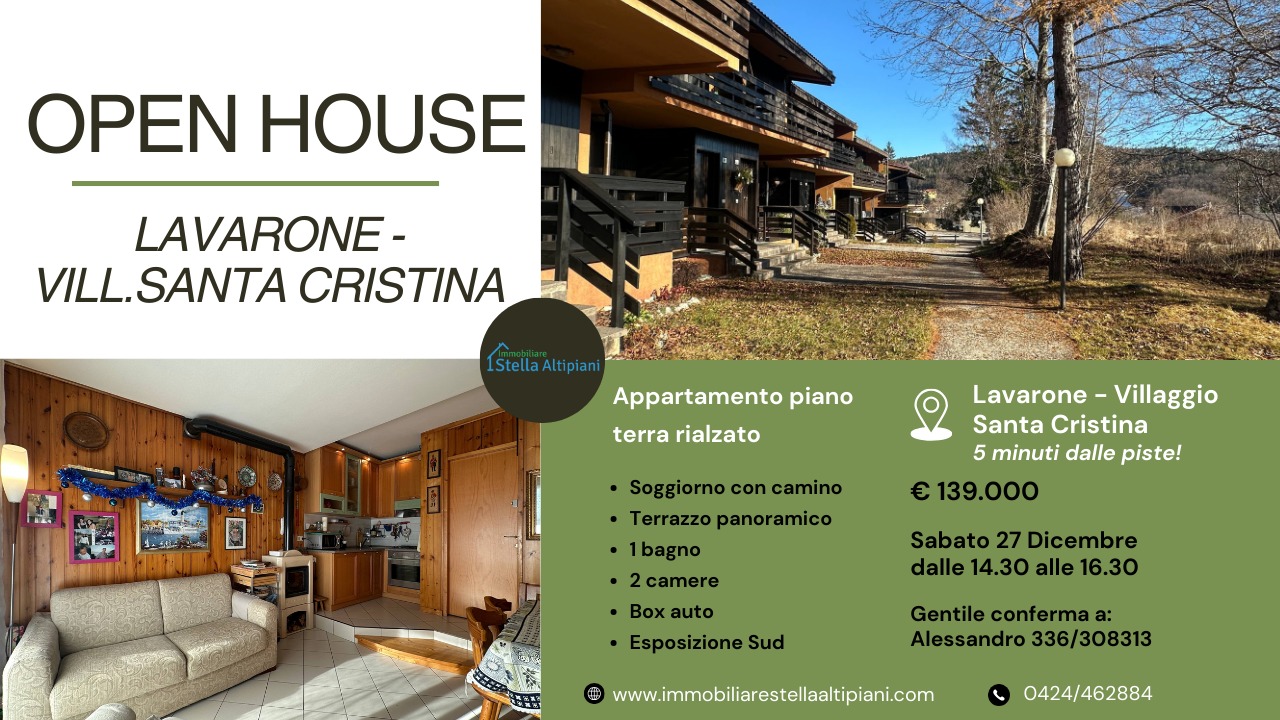 A Lavarone, nella frazione Bertoldi, proponiamo in vendita immobile al piano terra rialzato sito nel Villaggio Santa Cristina composto da luminosa zona giorno con funzionale angolo cottura e stufa a legna esposto a sud, camera matrimoniale, cameretta e bagno con doccia. La soluzione vanta inoltre di un terrazzino, box auto privato di 15 mq, posto macchina esterno e giardino comune con un ottimo panorama. Vera occasione per rilassarsi nelle vallate dell'alpe Cimbra! INFO PRENOTAZIONI OPENHOUSE ALLO 0424.462884 - 336.308313.