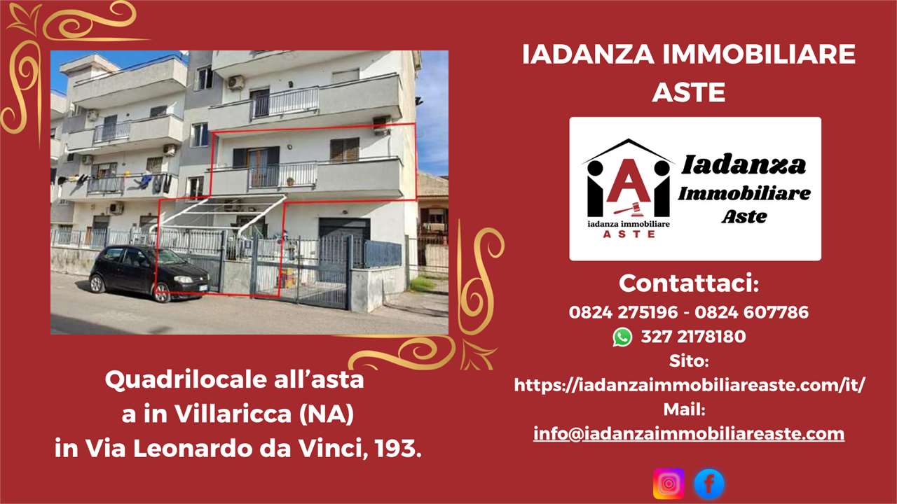 Codice Annuncio: V000996 AQR Offerta Minima: 58.500,00 Prezzo Base: 78.000,00 Valore di Perizia: 96.715,04 Data e Ora dellAsta: 21 luglio 2026 ore 15:00 Termine presentazione offerte: 20 luglio 2026 Appartamento (quadrilocale) allasta sito in Villaricca (NA), Via Leonardo da Vinci n.193. Limmobile sorge in zona centrale, densamente urbanizzata e dotata di servizi di urbanizzazione primaria e secondaria. Labitazione è ubicata tra piano terra e primo piano ed è facente parte di un fabbricato di quattro piani fuori terra, privo di ascensore. Limmobile, attualmente configurato come ununica unità abitativa, è composto da: al piano terra cucina e bagno; al primo piano, soggiorno, tre camere da letto, un bagno e due balconi. Per maggiori dettagli, documentazione completa o foto aggiuntive, visita il nostro Sito ufficiale o chiamaci. NOTE IMPORTANTI -Le informazioni, immagini e geolocalizzazione sono indicative e non costituiscono elemento contrattuale. -La documentazione ufficiale della procedura è lunico riferimento valido ai fini legali. -Si consiglia unattenta analisi tecnica e legale prima della partecipazione. Se hai bisogno di informazioni in modo rapido e senza impegno ti basterà chiamarci o scriverci tramite il nostro Sito Iadanza Aste Consulenza specializzata in immobili allasta su tutto il territorio nazionale. È possibile inoltre richiedere sopralluoghi tramite i recapiti dello Studio. -IADANZA ASTE- ////////////////////////////////SCOPRI LA DIFFERENZA////////////////////////// Perché sceglierci? Perché di noi ti puoi fidare ! Garantiamo assistenza completa per lacquisto di immobili allasta, con un approccio professionale, trasparente e orientato esclusivamente allinteresse dellacquirente. Cerca su Google Iadanza Immobiliare Aste per accedere a tutti i dettagli e richiedere assistenza gratuita. Vantaggi per chi vorrà avvalersi della nostra collaborazione : - Prima Consulenza gratuita e senza impegno - Analisi preventiva tecnico-legale - Supporto completo in tutte le fasi - Assistenza finanziaria personalizzata - Gestione operativa dellintero processo di acquisizione Servizi inclusi - Analisi documentale con professionisti dedicati - Supporto durante visite e verifiche - Assistenza nelle pratiche e nelle procedure - Affiancamento fino alla conclusione delloperazione Rif. Annuncio: AQR 122/2023