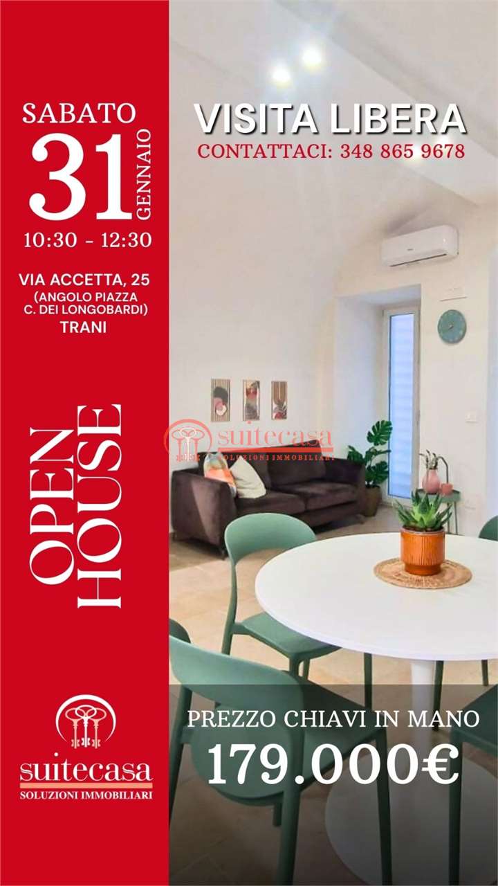 Opportunità di investimento pronta subito! Ti proponiamo un appartamento a piano terra situato nelle immediate vicinanze di Piazza Campo dei Longobardi, zona perfetta per gli amanti del porto, della parte storica di Trani nonché la preferita dei turisti. L'immobile abbraccia un grande bacino d'utenza poiché situato a piano terra, comodo per tutte le età per la mancanza di barriere architettoniche. E' composto da ingresso in luminosa zona living con angolo cottura, comoda e ampia camera da letto matrimoniale, grande bagno e lavanderia/ripostiglio. Potremmo raccontarvi delle finiture, dei dettagli, di come siano stati sapientemente lavorati il ferro e il legno per la realizzazione in opera di porte, infissi e arredo.... ma non lo faremo perché tutto questo non va raccontato, va toccato con mano. Contattaci e prenota la tua visita.