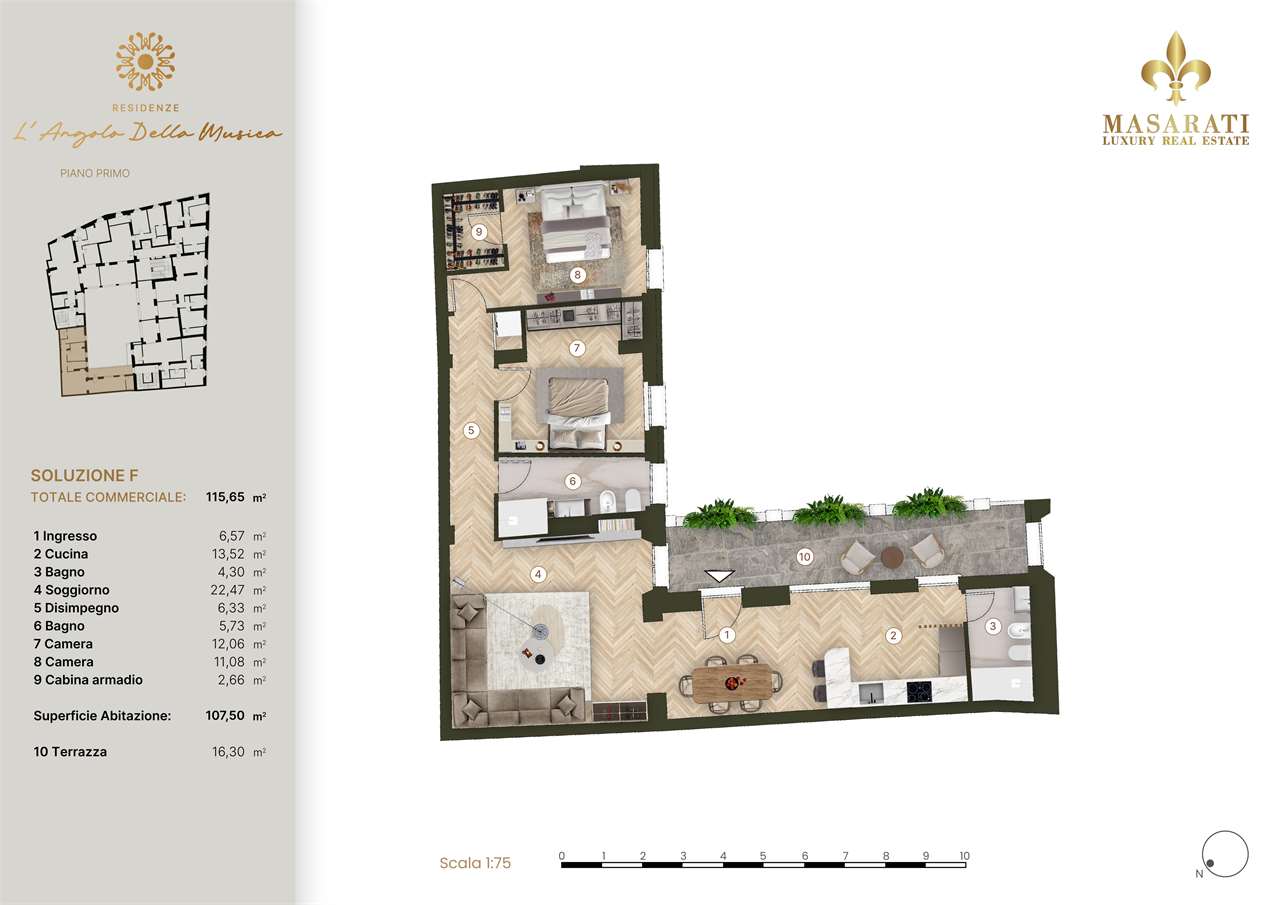 Residenza LAngolo della Musica Uneleganza che risuona nel cuore di Piacenza Unesclusiva Masarati Immobiliare Nel centro storico di Piacenza, allangolo tra via Scalabrini e via Nicolini, nasce un progetto unico che unisce la raffinatezza del passato e il comfort del presente. Allinterno di un palazzo settecentesco oggetto di un importante intervento di risanamento conservativo, prende forma Residenza LAngolo della Musica: un luogo dove architettura, storia e innovazione convivono in perfetta armonia. Ogni dettaglio è pensato per offrire unesperienza abitativa di prestigio e benessere: finiture di alto livello, impianti di domotica avanzata, riscaldamento e raffrescamento a pavimento, massimo isolamento acustico e termico. Il restauro valorizza gli elementi originali delledificio: il cortile interno porticato con colonne in pietra depoca e le cantine a volta in mattoni, autentiche testimonianze della sua storicità. Gli spazi interni, completamente ripensati, offrono abitazioni luminose, funzionali e dal design contemporaneo, arricchite da logge e verande che ampliano la vivibilità quotidiana. ________________________________________ Unità Abitativa "F Eleganza e comfort su 115 mq Un appartamento di grande respiro e armonia, ideale per chi desidera vivere il centro con stile. Superficie: 115 mq Composizione: ingresso su ampia cucina abitabile e bagno per gli ospiti, soggiorno, due camere matrimoniali (di cui una con cabina armadi), secondo bagno, terrazza coperta di 16 mq. Dotazioni: impianti di ultima generazione, materiali di pregio e soluzioni di design che fondono estetica e funzionalità. Disponibili per l'acquisto box singoli e doppi, oltre a cantine. ________________________________________ Comfort, riservatezza e fascino storico Le residenze si sviluppano dal piano nobile allattico, con al piano terra autorimesse private e ingressi indipendenti per la massima comodità. Un contesto esclusivo, curato in ogni dettaglio, pensato per chi cerca unabitazione di valore autentico in uno degli angoli più suggestivi della città.