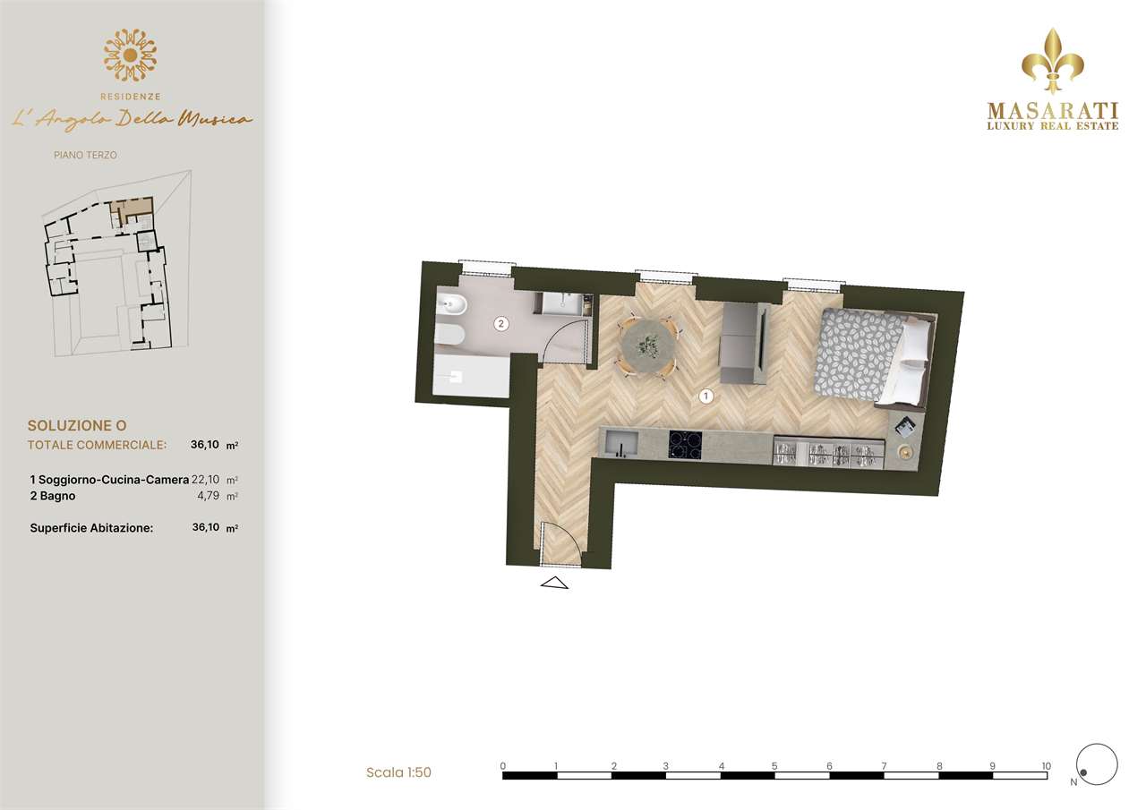Residenza LAngolo della Musica Uneleganza che risuona nel cuore di Piacenza Unesclusiva Masarati Immobiliare Nel centro storico di Piacenza, allangolo tra via Scalabrini e via Nicolini, nasce un progetto unico che unisce la raffinatezza del passato e il comfort del presente. Allinterno di un palazzo settecentesco oggetto di un importante intervento di risanamento conservativo, prende forma Residenza LAngolo della Musica: un luogo dove architettura, storia e innovazione convivono in perfetta armonia. Ogni dettaglio è pensato per offrire unesperienza abitativa di prestigio e benessere: finiture di alto livello, impianti di domotica avanzata, riscaldamento e raffrescamento a pavimento, massimo isolamento acustico e termico. Il restauro valorizza gli elementi originali delledificio: il cortile interno porticato con colonne in pietra depoca e le cantine a volta in mattoni, autentiche testimonianze della sua storicità. Gli spazi interni, completamente ripensati, offrono abitazioni luminose, funzionali e dal design contemporaneo, arricchite da logge e verande che ampliano la vivibilità quotidiana. ________________________________________ Unità Abitativa "O Monolocale di 36 mq Grazioso monolocale per chi desidera vivere il centro con stile. Superficie: 36 mq Composizione: ingresso su ambiente unico in cui trovano posto una cucina/soggiorno e una camera matrimoniale, oltre a bagno finestrato con doccia. Dotazioni: impianti di ultima generazione, materiali di pregio e soluzioni di design che fondono estetica e funzionalità. Disponibili per l'acquisto box singoli e doppi, oltre a cantine. ________________________________________ Comfort, riservatezza e fascino storico Le residenze si sviluppano dal piano nobile allattico, con al piano terra autorimesse private e ingressi indipendenti per la massima comodità. Un contesto esclusivo, curato in ogni dettaglio, pensato per chi cerca unabitazione di valore autentico in uno degli angoli più suggestivi della città.