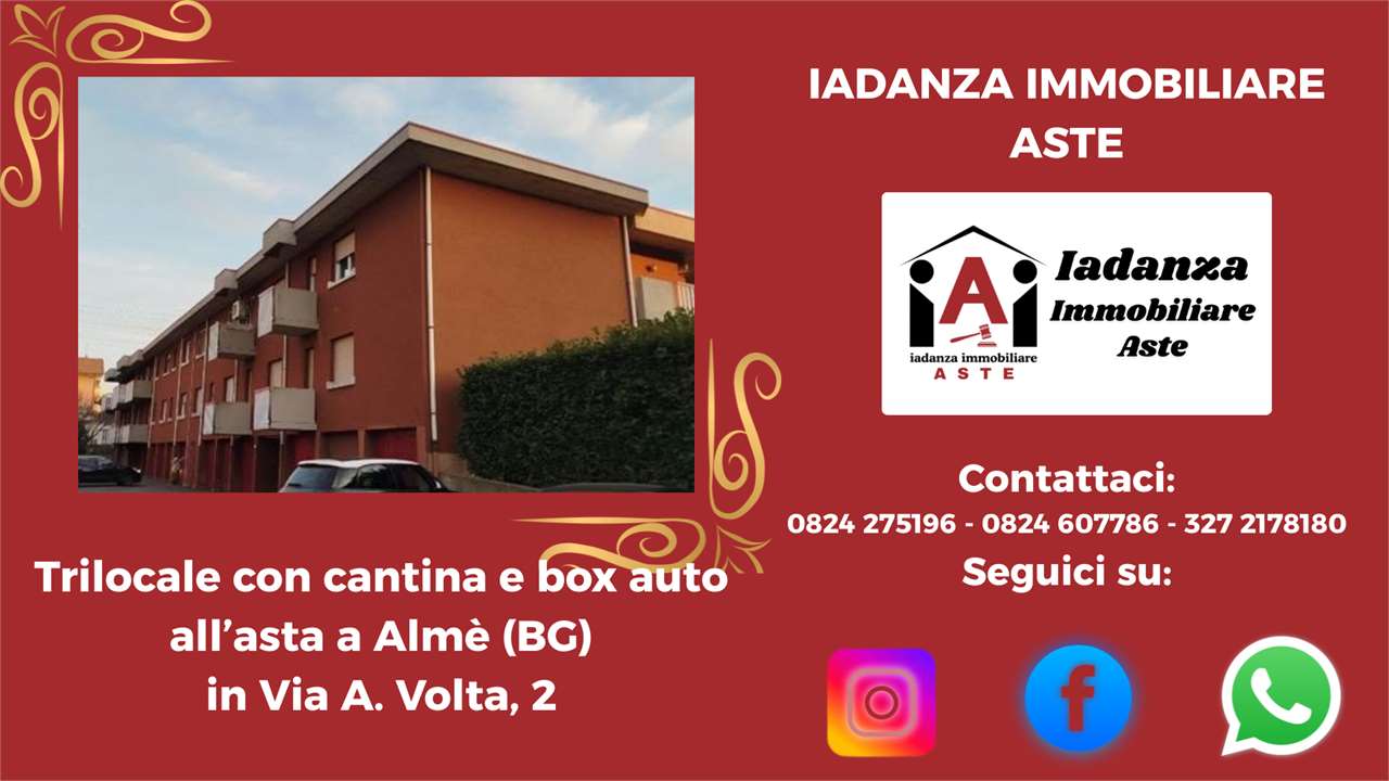 Codice Annuncio: 24TR406 Offerta Minima: 68.250,00 Prezzo Base: 91.000,00 Valore di Perizia: 91.000,00 Data e Ora dellAsta: 04/06/2026 ore 12:00 Termine Presentazione Offerte: 03/06/2026 ore 12:00 ******************************************************************************** N.B: -Le foto e la geolocalizzazione presenti negli annunci potrebbero essere solo indicative. La documentazione ufficiale invece è disponibile su richiesta e solo essa farà fede sul piano legale .CONTATTARE LO STUDIO PER CONFERMA E PER MAGGIORI INFORMAZIONI ! -La vendita allAsta dellimmobile è stata disposta dal TRIBUNALE DI COMPETENZA e presuppone che linteressato - qualora intenda partecipare in autonomia - abbia piena conoscenza e consapevolezza dei contenuti di tutta la documentazione riguardante la PROCEDURA se non intende rivolgersi ad un Professionista del Settore ! -Per avere maggiori informazioni o per richiedere un sopralluogo potrai contattarci ai seguenti recapiti : Tel: 0824.607786 - 0824.275196 - 327.2178180 Mail: info@iadanzaimmobiliareaste.com Web: www.iadanzaimmobiliareaste.com ******************************************************************************** Appartamento trilocale allasta sito in Almè (BG), Via Alessandro Volta n. 2B. Limmobile sorge in zona semicentrale, caratterizzata da contesto residenziale ben servito, dotato di servizi di urbanizzazione primaria e secondaria, con presenza di scuole, collegamenti pubblici e parcheggi. Labitazione è ubicata al primo piano di un edificio condominiale composto da tre piani fuori terra. Internamente limmobile si sviluppa con ingresso su ampia zona giorno open space, dalla quale si accede ad un corridoio che distribuisce due camere da letto, un bagno ed un ripostiglio. Sono presenti balconi accessibili tramite portefinestre. Completano la proprietà una cantina al piano terra, un box auto ed un appezzamento di terreno ad uso orto. ////////////////////////////////SCOPRI LA DIFFERENZA//////////////////////////////////////// Perché sceglierci? PERCHE DI NOI TI PUOI FIDARE! Ti basta compilare la richiesta presente a lato dellannuncio e riceverai tutta lassistenza necessaria per ricercare ed acquistare limmobile che desideri! ////////////////// PROMOZIONI ESCLUSIVE ONLINE///////////////////////// Oltretutto Inviandoci la tua richiesta tramite il FORM DI CONTATTO, presente sulla destra di tutti gli annunci inseriti sul nostro SITO www.iadanzaimmobiliareaste.com otterrai automaticamente: - Una Consulenza gratuita iniziale. - Una polizza Protezione Casa in OMAGGIO! - La restituzione delle spese di istruttoria (solo in caso di aggiudicazione). - Uno Sconto del 3% sul nostro compenso finale. ///////////////// I NOSTRI PUNTI DI FORZA//////////////////////////////////////// Ciò che ci rende unici è il nostro approccio dedicato e professionale, nell'interesse esclusivo del cliente acquirente. Consulenza Gratuita e Professionale: Sempre disponibili per una consulenza senza impegno, con cortesia e professionalità. Indipendenza e Trasparenza: Operiamo su rappresentanza soltanto in favore dellacquirente, senza l'assillo di dover vendere a tutti i costi, garantendo imparzialità e competenze. La nostra reputazione è la tua prima garanzia. Visite Immobiliari Organizzate: Se desideri visionare un immobile, organizziamo la visita in modo completamente gratuito, occupandoci noi di tutte le formalità telematiche necessarie. Istruttoria accurata: A differenza di molti operatori del Settore che si limitano a "smaltire" immobili come "visti e piaciuti", il nostro approfondito esame della pratica (legale, tecnico, condominiale, fiscale, finanziario) ti assicurerà la tranquillità che cercavi. Noi redigiamo una "Relazione di Fattibilità Tecnico/Legale" prima di ogni partecipazione all'asta che sintetizza ogni aspetto della Procedura. Siamo gli unici insomma a "metterci la faccia". Assistenza dedicata passo dopo passo: Il nostro consulente esperto ti assiste in ogni fase, dalla ricerca all'aggiudicazione e anche oltre. Ricerca Personalizzata: Se non hai tempo per la ricerca, inviaci la tua richiesta tramite il SITO e lo faremo noi per te. Chiarezza Contrattuale: Siamo uno Studio di Consulenza Tecnico/Legale, non un'agenzia immobiliare tradizionale. Il rapporto è regolato da un incarico chiaro, sottoscritto dalle parti, senza sorprese per il Cliente. ////////////////// SERVIZI DI BASE INCLUSI/////////////////////////////////////// Offriamo un pacchetto completo per assisterti e consigliarti nella massima sicurezza: Consulenza gratuita (telefonica o su appuntamento). Analisi documentale approfondita in collaborazione con esperti legali, tecnici, notai e commercialisti. Assistenza completa per ogni adempimento: visite, pratiche, firme digitali, domande di partecipazione, saldi, tasse, consegna immobile, sanatorie, ecc. Visita dellimmobile organizzata gratuitamente dal nostro Studio in via telematica. Consulenza creditizia su misura con un esperto di Banca. Supporto Stragiudiziale per analizzare e gestire situazioni debitorie complesse. ------------------------------------------------------------------------------------------------------------------------ CONTATTACI SUBITO Per avere maggiori informazioni o per richiedere un sopralluogo potrai contattarci ai seguenti recapiti : Tel: 0824.607786 - 0824.275196 - 327.2178180 Mail: info@iadanzaimmobiliareaste.com Web: www.iadanzaimmobiliareaste.com
