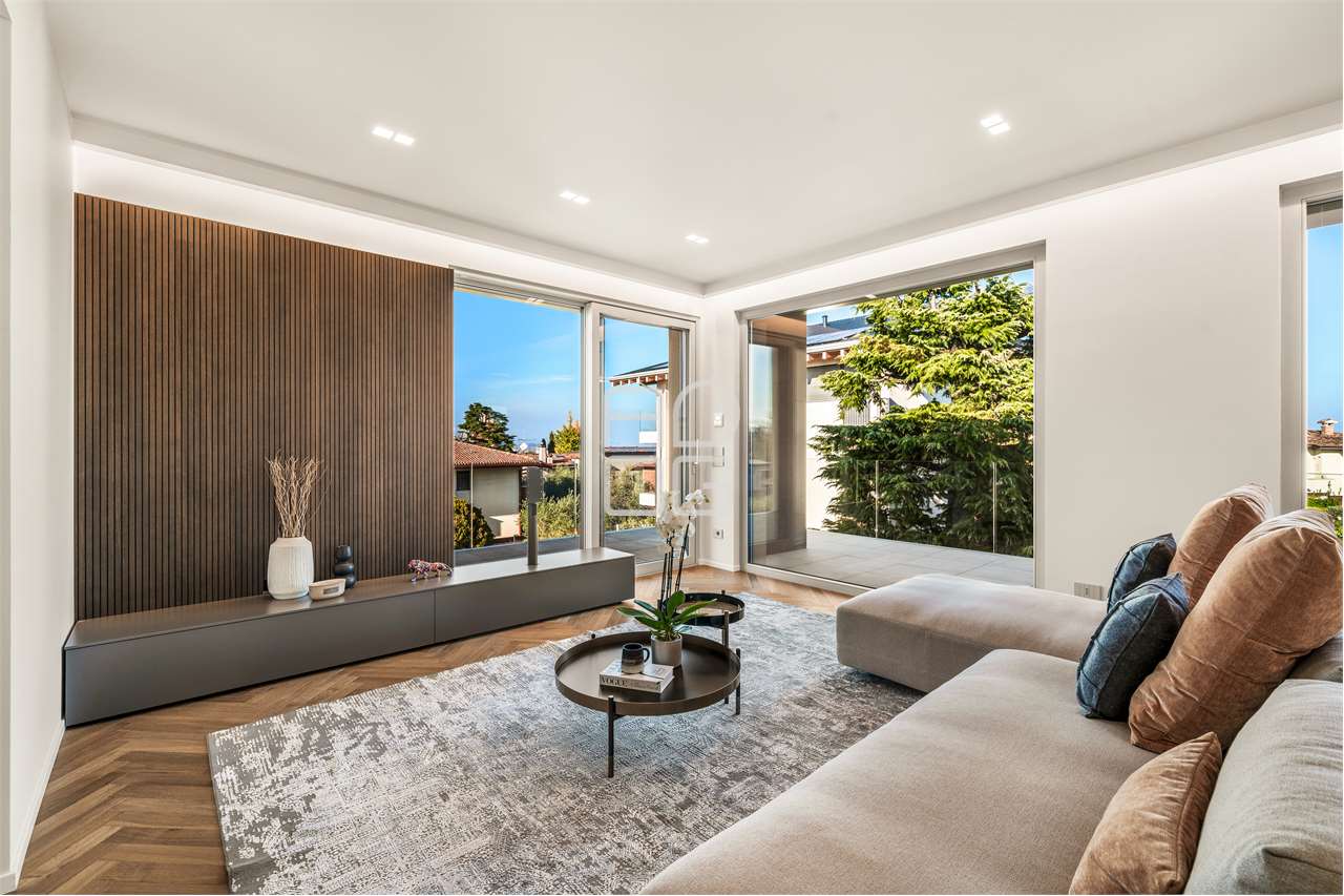 Inserita in rinomata e signorile zona collinare situata a poca distanza dal lago di Garda e da tutti i principali servizi, situata in riservato contesto residenziale, proponiamo esclusiva e importante villa singola dal design moderno caratterizzata da una splendida vista sul lago e sui paesaggi delle colline sottostanti. La villa si sviluppa su tre livelli uniti internamente dalla scenografica scala in acciaio e vetro e dall'ascensore di collegamento, ed è caratterizzata da ampie superfici interne ed esterne così suddivise: - al piano terra si sviluppa la zona notte composta da due spaziose camere, un bagno con doccia filo pavimento e un'ampia camera padronale completa di bagno privato e cabina armadio il tutto caratterizzato da accessi diretti all'area esterna e alla zona piscina e prendisole; - al piano primo troviamo l'ampia e luminosa zona living open space con pranzo e cucina a vista con accesso alla prima terrazza affacciata sulla zona piscina, un comodo bagno di servizio e uno splendido e luminoso salone con accesso attraverso la grande vetrata alla principale e spaziosa terrazza con stupenda vista sul lago di Garda; - al piano interrato, illuminato dalla grande vetrata del vano scala, troviamo un ampio locale open space dover poter cerare a seconda delle proprie esigenze uno studio o una zona ospiti o una palestra e SPA e dove poter creare eventualmente un'altro bagno, il locale tecnico con zona lavanderia e infine direttamente collegato il garage dove poter comodamente parcheggiare fino a tre autovetture. Il progetto, curato in ogni dettaglio, prevede la realizzazione di una splendida piscina, dalla quale godere delle vista sul lago, inserita in un bellissimo giardino piantumato con impianto di irrigazione automatica e con la possibilità di creare una zona dehor e cucina esterni. Immobile di grande prestigio, caratterizzato da un linguaggio architettonico moderno minimalista e da tecniche costruttive di ultima generazione volte a garantire rispetto dellambiente ed un elevata classe energetica, oltre ad una struttura antisismica e le finiture di altissimo livello quali lastre di grandi dimensioni per pavimenti e rivestimenti, porte raso muro, fotovoltaiko di 8kw, ventilazione meccanica controllata, condizionamento con sistema VRV e altro ancora compresa la possibilità di fornitura arredo completo. Consegna prevista Aprile 2026. Restiamo a disposizione per maggiori dettagli ed eventuale sopralluogo. NB: le immagini reali proposte si riferiscono alla Villa B, attualmente ultimata e già venduta, al fine di mostrare la qualità di alcune finiture interne ed esterne previste mentre i Render alla Villa A proposta in vendita.