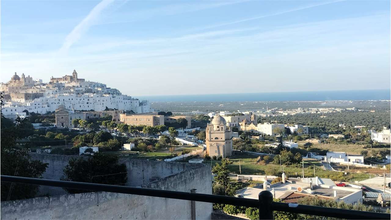 LAMIA in PIETRA sita in OSTUNI alla Contrada Candelora, destinazione deposito, composta da un vano con camino e area esterna pertinenziale, oltre a terreno circostante di circa mq. 9.869 con alberi di ulivo. VISTA PANORAMICA sul centro storico di OSTUNI, la “Citta bianca”. Antistante la lamia vi è un ombreggiante in struttura provvisoria.