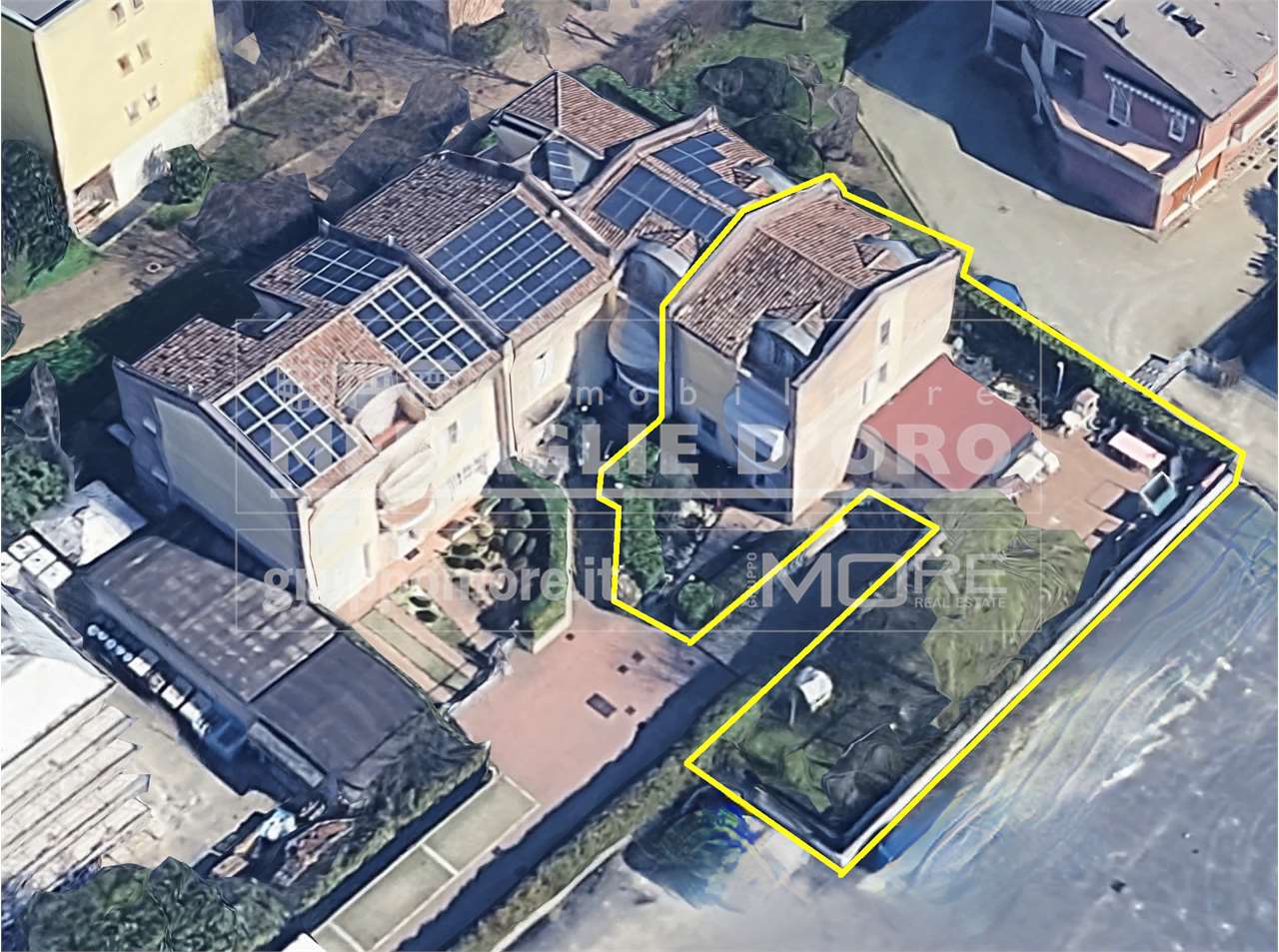 COD 2843 VILLA BIFAMILIARE SIGNORILE MEDOLLA Introduzione La Remax Unicorn vende a Medolla una villa plurifamiliare dal design originale, la cui architettura d’autore dona spazi abitativi aperti, di ampia superficie e dalla luminosità speciale. La villa è collocata in una posizione appartata di Medolla, nonostante l'accesso alla proprietà sia dalla strada Provinciale, la quale collega velocemente Medolla a San Felice sul Panaro e viceversa. La villa è stata disegnata con geometrie regolari tipiche dell’architettura moderna e funzionalista e tutti gli spazi richiamano lo stile industriale o “loft”. Le ampie vetrate donano senso di continuità con il verde circostante, i materiali semplici ed espressivi quali metallo, vetro e legno donano continuità e pulizia visiva. ESTERNI Si accede alla proprietà da una larga cancellata, tramite il vialetto in porfido che prosegue attorno alla villa fino agli accessi dei garage. I garage sono in totale 2 con due posti macchina ciascuno, oltre ad un terzo spazio coperto, per un totale di 6 posti auto al chiuso. Gli spazi di transizione tra le abitazione e l'esterno sono coperti da portici e dalle larghe falde del tetto. Fa eccezione il cortile interno, volutamente scoperto a pozzo di luce e circondato dalle mura delle abitazioni, creato apposta per momenti di relax e convivialità. Il giardino perimetrale è in continuità con il verde privato della villa storica padronale, la quale è collocata a circa 100 metri di distanza dalla villa in vendita. INTERNI La villa bifamiliare è disposta su piano terra e primo, con tre scale interne. La prima abitazione è costituita da un grande soggiorno con il camino a legna, il disimpegno e le scale a giorno, a seguire la cucina aperta, volutamente allineata in prospettiva con il camino. Le travi e le vetrate scandiscono visivamente gli ambienti e questo ritmo strutturale si ripete in tutta la casa. Seguono, a piano terra, gli ambienti accessori quali un ampio sgombero, il locale caldaia, il bagno e la cantina. Tramite le funzionali scale a giorno di legno e acciaio, si arriva al piano superiore su un grande ballatoio, cha fa da disimpegno alle due camere da letto matrimoniali: ciascuna camera è dotata di bagno privato e armadiature. Questa abitazione è caratterizzata da arredi fissi integrati, tra cui la cucina, l ‘arredo bagno ed i box doccia: grazie a questo accorgimento, lo stato di conservazione è eccellente. Comunicanti con questa abitazione, sono il cortile interno, il garage e un locale open space, disposto sul piano primo e collegato con la scala a chiocciola, nella sua qualità di soffitta valorizzata e autonoma: una deliziosa parte della casa ideale per familiari che vogliono una certa indipendenza. La seconda abitazione ha una distribuzione più compatta, costituita al piano terra da un bell’ingresso, la cucina ed il soggiorno, con un bagno di servizio. Al piano superiore 2 camere da letto molto grandi, ancora un ballatoio ampio quanto un salotto ed il bagno. Le travi a vista nella parte superiore, visibili anche dai lati, sporgenti e molto coprenti verso l'esterno, comunicano solidità agli ambienti e un tocco architettonico tecnico ed elegante. Nel complesso lo studio pragmatico di questa villa, con richiami rustico-industriali ha garantito nel tempo una convivenza armoniosa tra i due nuclei familiari con una gestione non dispersiva e nemmeno dispendiosa degli spazi comuni, favorendo l’ottimo stato conservativo attuale dello stabile.