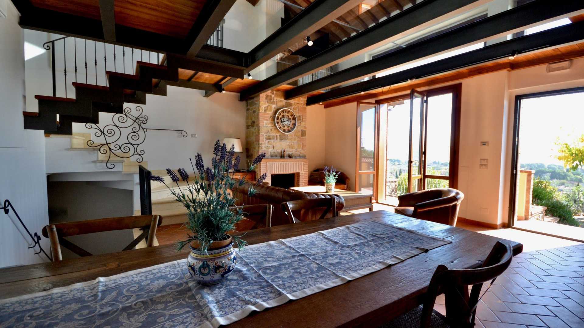 Villa in collina, a Castel Rigone (sopra Passignano sul Trasimeno). In posizione panoramica sulle colline e sul lago Trasimeno la villa gode di ampi spazi esterni (corte fronte casa, giarino e alberi tutto intorno. E' stata realizzata nel 2002 dalla Ditta RUBNER (Aziende leader nella costruzione di case in legno - abbiamo inserito alcune foto delle caratteristiche); la base e il piano terra sono in cemento armato, mentre il piano primo e il secondo (mansardato) sono in legno. Il piano terra è composto da ampio soggiorno con stufa in maiolica, cucina, bagno, lavanderia, ripostiglio e ampio garage; il piano superiore, da cui si accede anche da scale esterna, si compone di soggiorno con camino ventilato, sala pranzo, cucina, tre camere, due bagni e bellissimo-vivibile terrazzo panoramico; il piano superiore (mansardato) presente due camere, bagno e terrazzo. Adiacente alla villa abbiamo un ulteriore garage doppio, un magazzino/fondo ed una veranda esterna con vasca idromassaggio. Esternamente la proprietà è interamente recintata, si accede da un passaggio pedonale e da cancello elettrico carrabile, piante da frutto, lecci, querce e una splendido glicine davanti la casa, percorsi pedonali tutto intorno. E' presento il pozzo, impianto di allarme e legnaia.