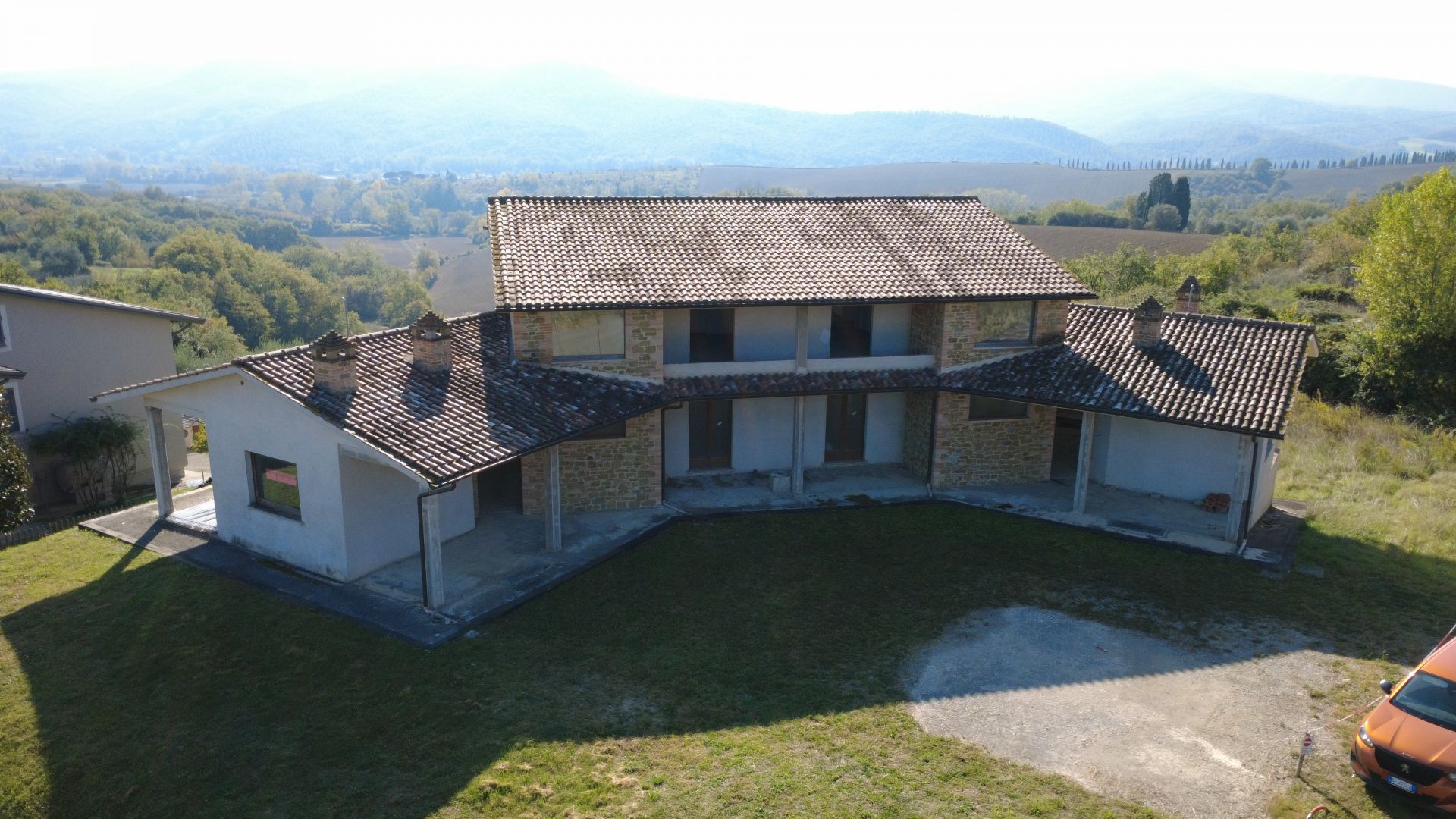 A poca distanza dal centro storico di Panicale, in graziosa zona residenziale in posizione collinare molto panoramica, porzione di villa bifamiliare di 400 mq circa che si sviluppa su tre livelli come segue:Piano seminterrato: grande garage, ampia cantina, lavanderia, bagno, fondo e centrale termica;Piano terra: ingresso, grande soggiorno con angolo cottura ed accesso ai portici, bagno, due camere matrimoniali, di cui una con bagno, guardaroba ed accesso al terrazzo.Piano primo: due camere di cui una con terrazzo coperto e bagno.La proprietà si trova allo stato grezzo, in ottime condizioni, con impianti già predisposti che vanno solamente allacciati (attuale predisposizione per riscaldamento a pavimento) e necessita di finiture quali: scelta del pavimento, rivestimenti, bagni ed infissi (finestre già presenti) e comprende terreno circostante di 1800 mq, attualmente ad uso comune con la proprietà gemella adiacente, anch'essa in vendita allo stesso prezzo. Lo stato attuale permette di personalizzare le finiture a proprio piacimento ed è inoltre possibile costruire una piscina. Ottima esposizione, vista panoramica in contesto molto tranquillo.