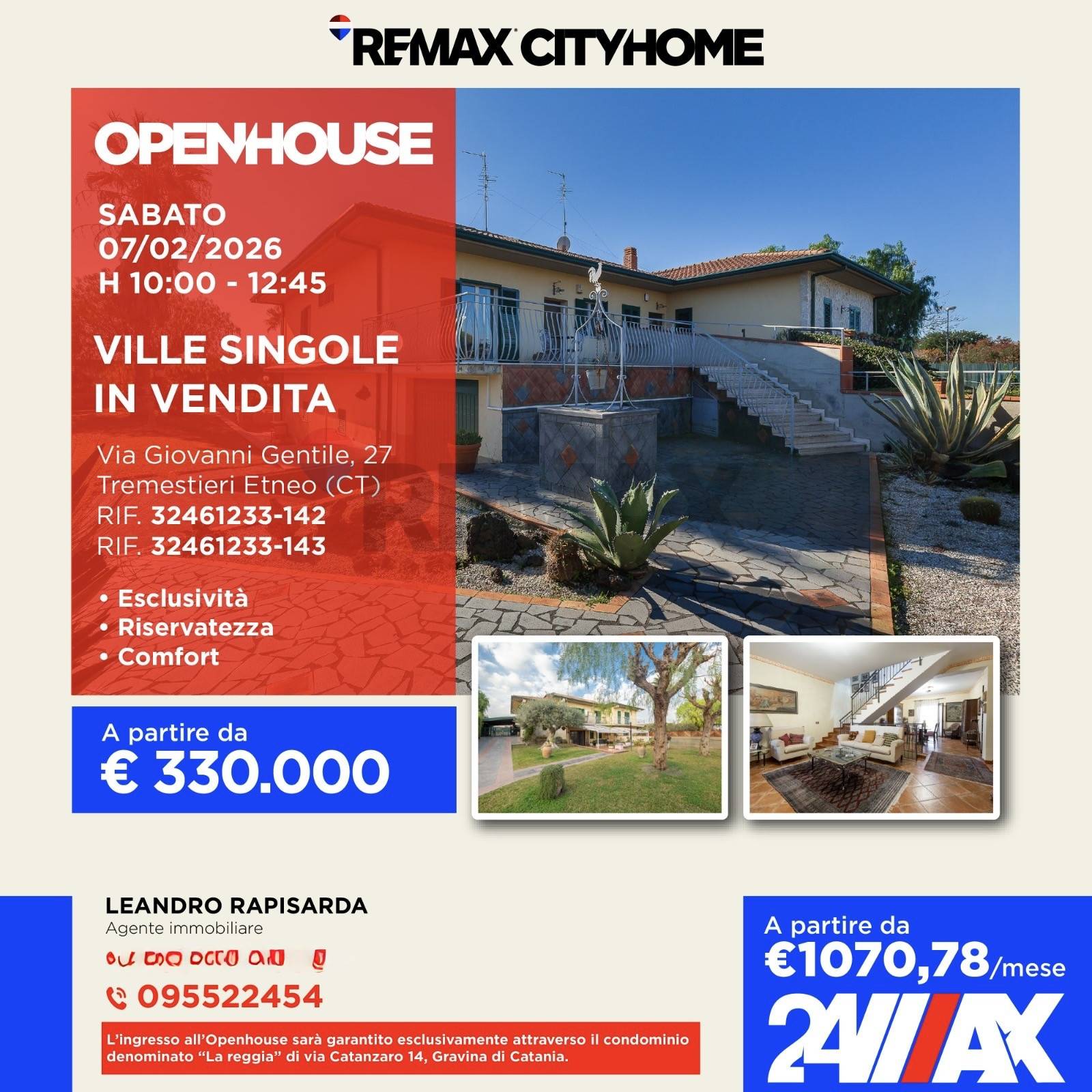 OPEN HOUSE SABATO 7 FEBBRAIO DALLE 10:00 ALLE 12:45 Tremestieri Etneo Panoramica Villa singola con ampio giardino. Siamo lieti di presentare una soluzione immobiliare completa, solida ed elegante, ideale per chi desidera una villa indipendente di rappresentanza, immersa nel verde ma perfettamente inserita in un contesto urbano servito e strategico. La villa sorge su un ampio lotto di terreno e si distingue fin da subito per la presenza di due ingressi carrabili, elemento che garantisce comfort, funzionalità. L’accesso alla proprietà avviene attraverso un giardino curato, arricchito da essenze ornamentali e dotato di impianto di irrigazione, che accompagna armoniosamente verso l’abitazione e ne valorizza il carattere indipendente. La distribuzione interna si sviluppa su tre livelli, collegati da scale interne in marmo, che conferiscono continuità agli spazi. Il piano terra accoglie l’ingresso principale su un ampio soggiorno doppio, luminoso e ben proporzionato, affiancato da due camere da letto e doppi servizi, offrendo una zona giorno e notte comoda e funzionale. Il piano primo mansardato ospita due ulteriori camere da letto, ideali come area notte aggiuntiva, studio o spazi dedicati agli ospiti. Il piano entro terra, regolarmente collegato all’abitazione, è destinato a cantina ed è composto da una spaziosa cucina-soggiorno, un ripostiglio e un bagno, risultando estremamente versatile e adatto a molteplici utilizzi. Completano la proprietà un garage di grandi dimensioni e un portico coperto per il ricovero delle auto, oltre a balconi e terrazze che garantiscono affacci gradevoli e luminosità durante l’intera giornata grazie all’esposizione mista. La conformazione del terreno consente inoltre la realizzazione di una piscina, valorizzando ulteriormente l’area esterna. A rendere la villa particolarmente suggestiva è la splendida vista panoramica sull’Etna, che impreziosisce l’abitazione e ne rafforza il carattere esclusivo.