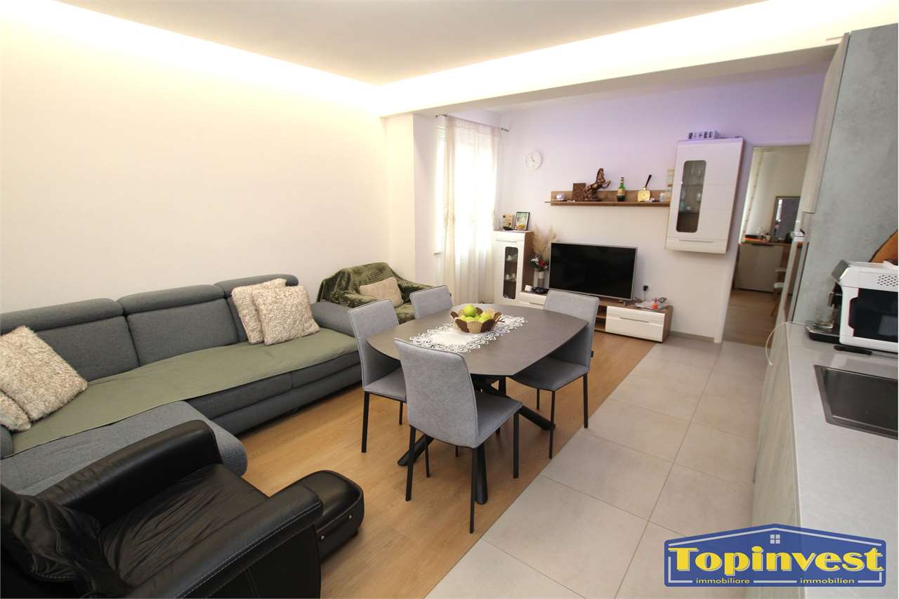 Trilocale in posizione centrale, completamente ristrutturato, 1.piano, 84 mq, suddvisi in: soggiorno con angolo cottura, 2 stanze da letto, una piccola stanza, 2 bagni, ingresso e cantina. Garage extra.