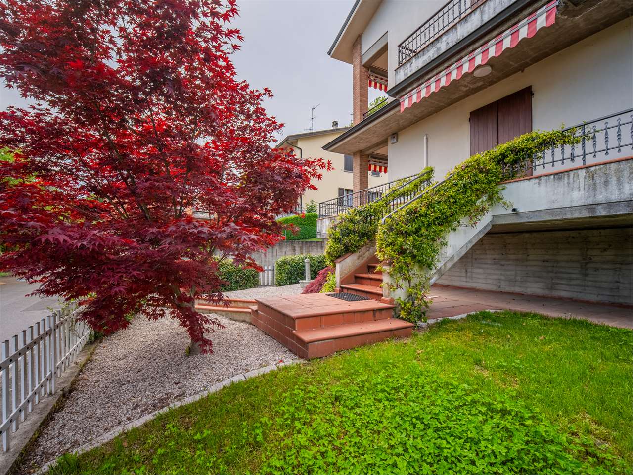 In zona residenziale comoda ai servizi ed in strada chiusa, proponiamo elegante villa abbinata di fine anni '80 di circa 221 mq. dalle ottime metrature così composta: ingresso al piano rialzato con bellissimo loggiato che collega tutta la zona giorno, disimpegno con camera matrimoniale, balcone e bagno; stanza pluriuso con scala a chiocciola che si collega al piano interrato. Al primo piano, il tutto collegato da maestosa scala in legno, zona open-space pluriuso con balcone, cucinotto, disimpegno notte con camera matrimoniale, balcone e bagno. Al piano interrato, lavanderia, locale caldaia, cantina, due ripostigli ed ampio garage di 32 mq con ingresso da cancello automatico comune con il vicino. Completa la proprietà giardino privato con irrigazione automatica di 166 mq. Proprietà spaziosa, versatile; completa di aria condizionata con pompa di calore, allarme, tende da sole, camino.