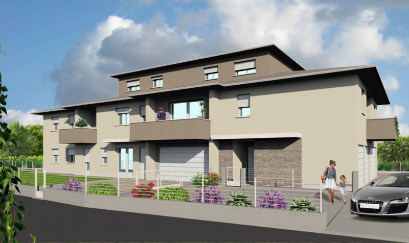 Porzione di bifamiliare disposta su due livelli con ingresso indipendente pedonale privato e ampio giardino privato di circa 200 mtq. L'unita' immobiliare e' composta da soggiorno con angolo cucina, un bagno, un ripostiglio ed un garage doppio in larghezza al piano terra. Al primo piano tre camere da letto spaziose, due balconi e un bagno.Ottime finiture.Inizio lavori inverno 2020 . Classe energetica A