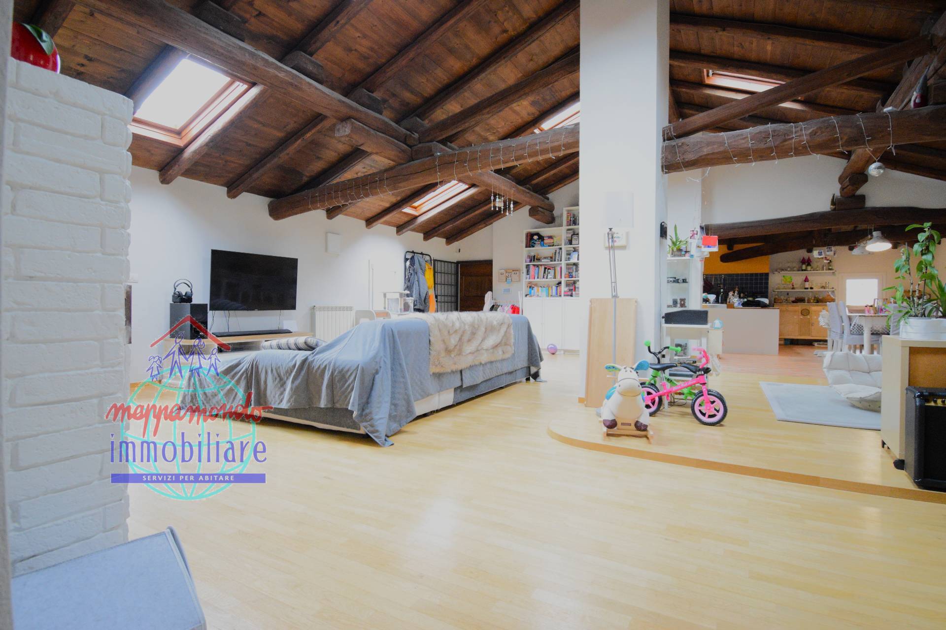 Ampio Loft con travi a vista, camino e parco privato a <strong>Bentivoglio (BO)</strong> <br>In un’oasi di pace e riservatezza, proponiamo in vendita una residenza unica nel suo genere: un ampio appartamento situato al piano secondo di una soluzione bifamiliare. <br><strong>Gli Interni: Spazio, Luce e Carattere. </strong>L'abitazione ha ambienti luminosi e volumi generosi, caratterizzati da splendide travi a vista e pavimentazione in <strong>parquet</strong> che donano calore a ogni stanza.<br><ul><li><strong>Zona Giorno:</strong> Un immenso living open-space con <strong>termo camino</strong>, perfetto per le serate invernali, e una cucina a vista che si integra armoniosamente, creando un ambiente conviviale e moderno.</li><li><strong>Zona Notte:</strong> Un corridoio conduce alle <strong>tre camere da letto</strong> e al bagno finestrato, rifinito con cura.</li><li><strong>Dettagli che fanno la differenza:</strong> Le altezze interne e la cura dei particolari architettonici rendono questa casa un oggetto raro sul mercato. Nessuna spesa condominiale.</li></ul><strong>L'Esterno: Un Parco Privato. </strong>La proprietà vanta un <strong>ampio giardino</strong>, totalmente recintato e curato nei minimi dettagli. <br>Uno spazio ideale per pranzi all'aperto, il relax dei bambini o per chi possiede animali domestici. <br>Completano la soluzione <strong>due posti auto privati</strong> all'interno della corte comune, protetta da cancello elettronico.<br><strong>Tecnologia ed Efficienza Energetica. </strong>L’immobile è pronto per il futuro grazie a una dotazione tecnica d'eccellenza:<br><ul><li><strong>Classe Energetica B:</strong> Efficienza garantita e consumi ridotti.</li><li><strong>Climatizzazione:</strong> Riscaldamento autonomo.</li><li><strong>Domotica:</strong> Gestione da remoto tramite smartphone per condizionatori, cancello elettrico, portone d'ingresso e videocitofono. Sicurezza e comfort a portata di click.</li></ul><strong>Perché scegliere questa casa?</strong> È la soluzione ideale per chi cerca l’indipendenza di una villa senza rinunciare alla sicurezza e alla comodità tecnologica, immersi nel verde ma a pochi minuti dai servizi di Bentivoglio.<br>Non lasciarti sfuggire questa opportunità. Contattaci oggi stesso per prenotare la tua visita in agenzia e scoprire la tua nuova casa!