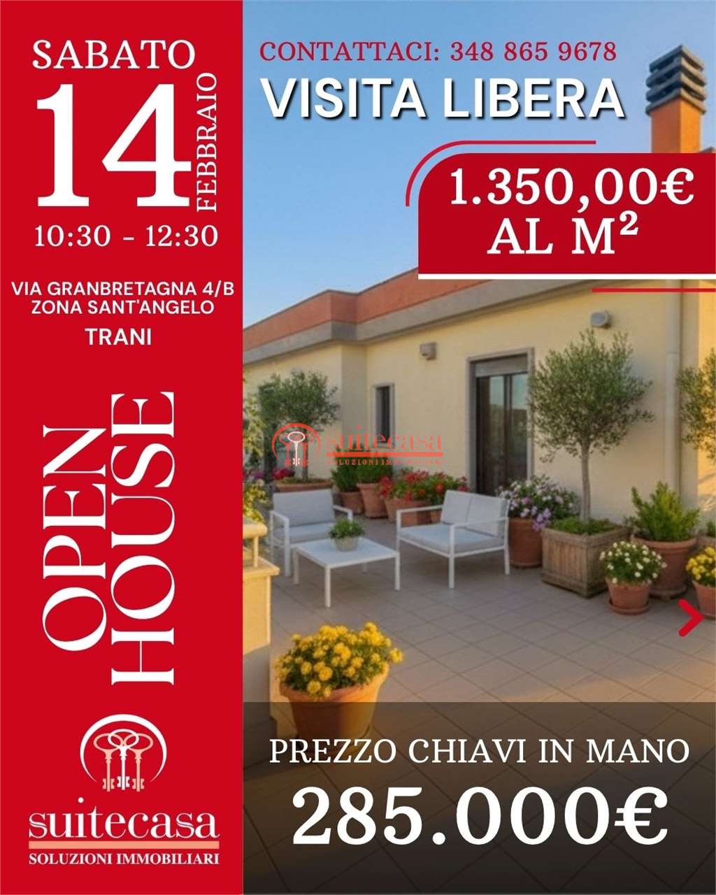 Vivere in completa libertà è il tuo sogno? A Trani: comfort, luce e spazi aperti. Proponiamo in vendita un attico situato in una delle zone più servite in questo momento di Trani (vicinanze Istituto Tecnico Commerciale/Ragioneria). L'immobile, in ottime condizioni manutentive, rappresenta la soluzione ideale per chi cerca una dimora luminosa e accogliente, immersa nel verde. Caratteristiche Principali - L'appartamento si distingue per la sua eccezionale luminosità e la distribuzione funzionale degli spazi: - Zona Giorno: ingresso in ampio salone, cucina abitabile spaziosa e funzionale. - Zona Notte: 3 Camere da letto confortevoli e bagni ben rifiniti. - Il Valore Aggiunto: grandi verande abitabili, perfette per cene all'aperto, zone relax o per creare un giardino d'inverno privato. - Comfort: aria condizionata già installata e Classe Energetica F. - Il Contesto: l'attico fa parte di un residence caratterizzato da grandi giardini condominiali curati, ideali per famiglie o per chi desidera un polmone verde sotto casa; contesto silenzioso e sicuro - Posizione strategica: a pochi passi dalle scuole e dai principali servizi, ma lontano dal caos cittadino. Dettagli Tecnici - Stato: Abitabile / Ben tenuto - Climatizzazione: Sì - Classe Energetica: F Sito Web: www.suitecasa.com Contattaci per una visita! Non perdere l'occasione di vivere in un attico che unisce l'indipendenza delle grandi verande alla sicurezza di un residence .