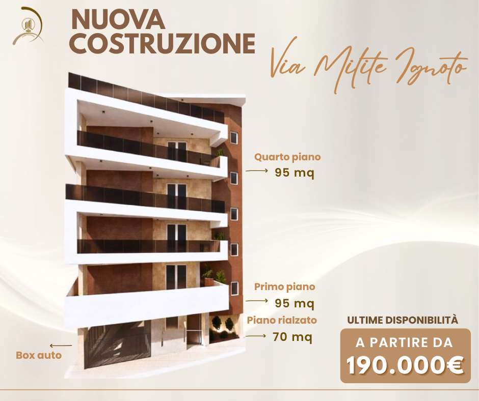 Proponiamo in vendita appartamenti di nuova costruzione, in fase di completamento, situati in una delle zone più richieste e apprezzate della città, precisamente in Via Milite Ignoto. Soluzioni ideali per chi è alla ricerca di una residenza moderna, luminosa e funzionale, in posizione strategica, a breve distanza dal centro e nelle immediate vicinanze di spazi verdi, perfette sia come prima abitazione sia come investimento di valore. Le ultime disponibilità riguardano appartamenti angolari, caratterizzati da grande luminosità e ottima vivibilità. Le diverse soluzioni presentano metrature e distribuzioni differenti, tutte dotate di balconi vivibili, pensati come naturale estensione degli spazi interni. Gli immobili sono rifiniti con materiali di qualità, con particolare attenzione ai dettagli, al comfort abitativo e alla qualità costruttiva. Disponibilità attuali: PIANO RIALZATO di circa 70 mq interni PRIMO PIANO di circa 95 mq interni QUARTO PIANO di circa 95 mq interni Box auto PREZZO A PARTIRE DA 190.000