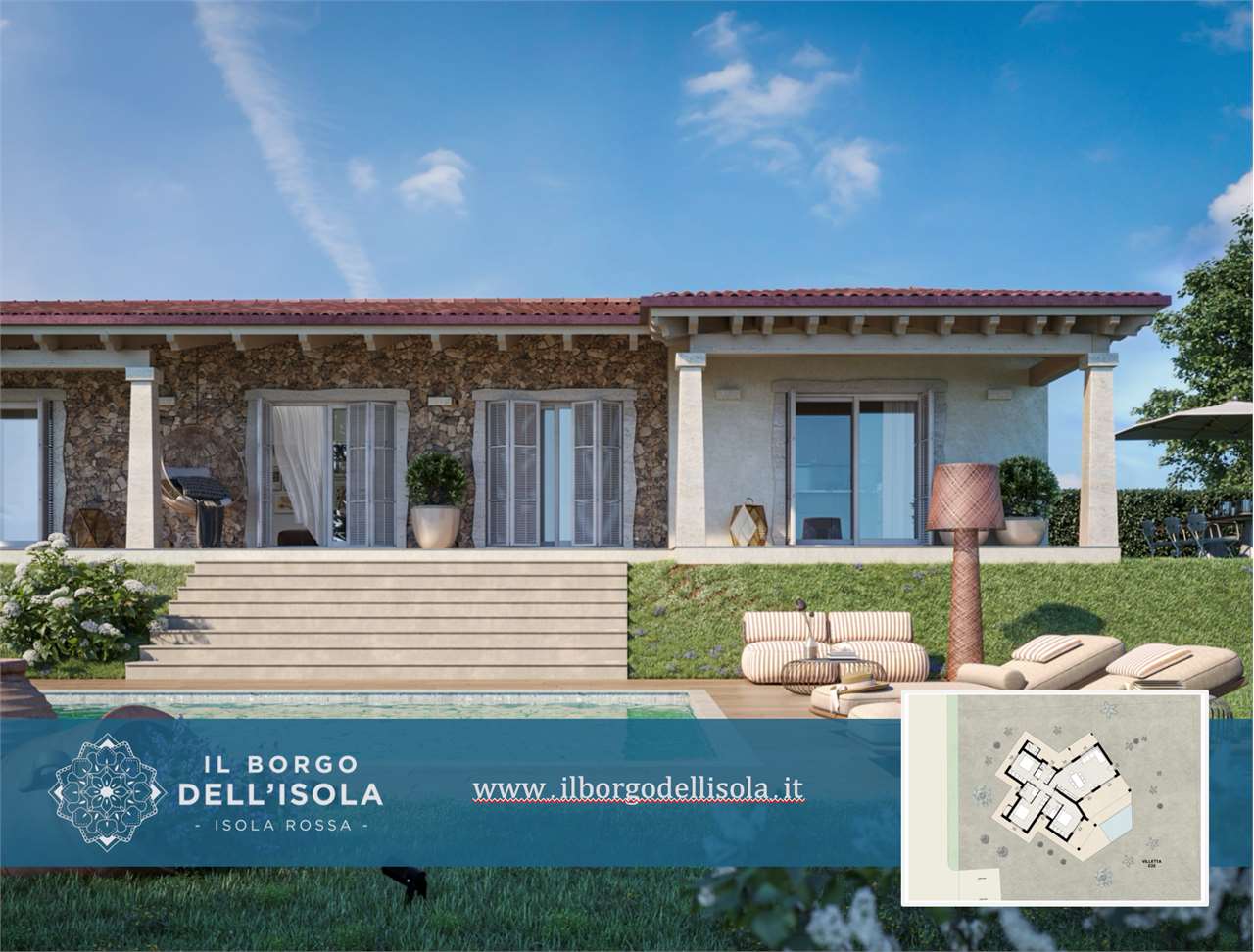 Il Borgo dell'Isola C26 Villa Singola Villa Singola situata in posizione privilegiata all'interno della lottizzazione libera su tutti i lati e con giardino privato. La villa è composta: Zona giorno con grande apertura verso il mare e ampia veranda 3 camere matrimoniali 3 bagni ripostigli sul retro e all'interno doppio posto auto privato possibilità di costruire la piscina ampio giardino MQ COMMERCIALI 179,19 mq interni lordi 135 mq verande 33,20 mq giardino 655 Il progetto sorge nella rinomata località turistica di Isola Rossa nel comune di Trinità d'Agultu e Vignola ed è inserito in un ambito residenziale collocato a distanza pedonale dalle spiagge e dal mare, già dotata di tutti i servizi primari e ottimamente collegato al centro abitato del borgo turistico.â Il complesso prevede la realizzazione di Villette sia unifamiliari che suddivise in piccole unità abitative. Ogni villa avrà il suo terreno di proprietà regalando allabitazione privacy e spazi esterni con possibilità anche di avere una piscina. Le ville sono costruite secondo larchitettura locale utilizzando materiali di pregio al fine di rivolgersi ad una clientela più raffinata ed esigente. Tutte le ville sono dotate di confort e personalizzabili. Le abitazioni vengono costruite ad alta efficienza energetica, in classe A, ove lisolamento termico è garantito da pareti di NORMABLOK a taglio termico, da tetti isolati realizzati con travi di legno bianco spazzolato a vista e da infissi e serramenti in alluminio a taglio termico. Le nostre soluzioni vantano stipiti esterni e colonnati arricchiti in granito sardo. Ognuna di esse è predisposta per linstallazione di climatizzazione estiva e riscaldamento invernale a pompa di calore di tipo autonomo. LE FOTO DELL'ANNUNCIO SONO PURAMENTE INDICATIVE.