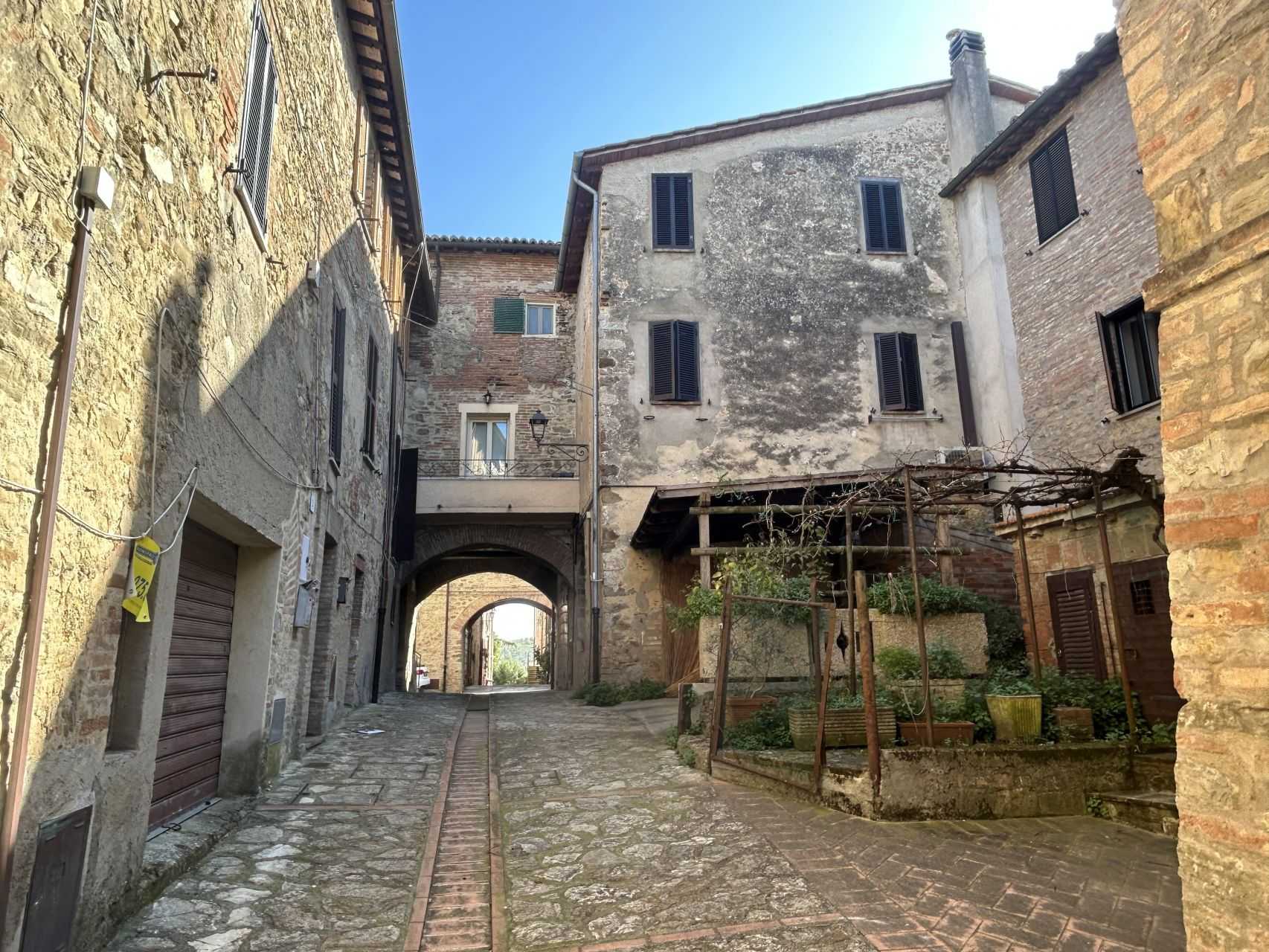 In un piccolo borgo a 10 minuti da Solomeo, dal Lago Trasimeno e da Perugia, casa indipendentecielo terra libera su tre lati su tre livelli.La casa, originaria degli anni ’60 e poi ristrutturata in varie parti e resa antisismica e con tettorifatto e coibentato nel 2022, misura complessivamente 200 mq e si compone nel modo seguente:. piano terra: ampi fondi e garage doppio per 70 mq complessivi, ripostiglio, locale uso lavanderia. piano primo: appartamento composto da disimpegno, cucina abitabile (nuova), salotto luminoso,due camere da letto matrimoniali e bagno. piano secondo: soffitta al grezzo e terrazzina a tasca di 16 mq.Posti auto esterni privati. Riscaldamento tramite caldaia a metano, stufa a legna.
