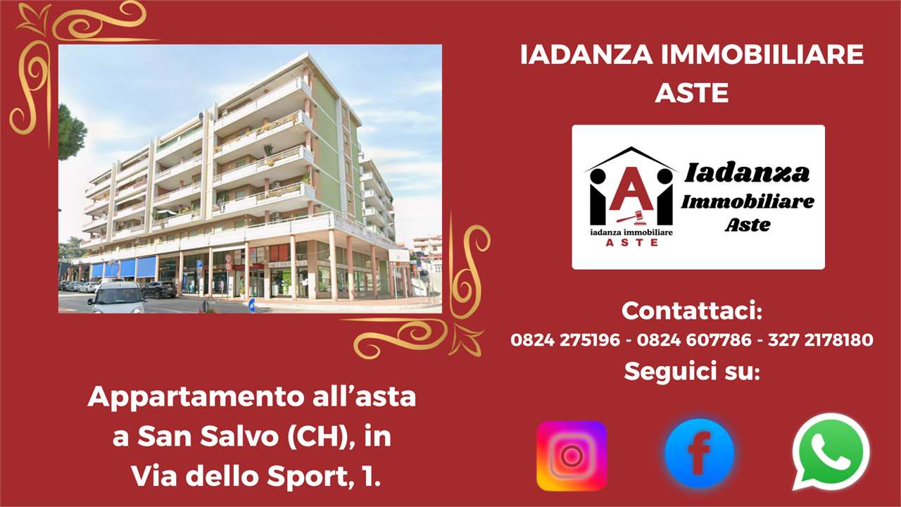 CODICE ANNUNCIO: 23-2024 QR+ PREZZO BASE: 134.388,00 OFFERTA MINIMA: 100.791,00 VALORE PERIZIA: 169.400,00 DATA ASTA: 21/05/2026 18:00 TERMINE PRESENTAZIONE OFFERTE: 19/05/2026 13:00 //////////////////////////////////////////////////////////////////////////////////////////////// N.B - La geolocalizzazione ed alcune foto presenti nellAnnuncio potrebbero non corrispondere fedelmente. Contattare lo Studio per conferma e per maggiori informazioni ! //////////////////////////////////////////////////////////////////////////////////////////////// Appartamento all'asta a San salvo, sito in Via dello Sport n. 1. Il bene in questione sorge all'interno del centro storico del paese e gode di affaccio diretto sulla Villa Comunale. L'unità immobiliare fa parte di un complesso condominiale di più ampia consistenza, che si sviluppa su cinque piani fuori terra. Nel dettaglio l'appartamento è posto al piano rialzato e risulta così distribuito: -ingresso su disimpegno, ampio soggiorno, cucina, corridoio di distribuzione, tre camere da letto e due bagni. L'abitazione presenta, inoltre, due grandi terrazzi esclusivi con ampiezza variabile ed un portico coperto con affaccio su via Istonia. ///////////////////////////////////////////////////////////////////////////////////////////// Se vuoi saperne di più su questa proposta, puoi consultarci ai seguenti recapiti: Tel. 0824.607786 - 0824.275196 - 327.2178180 - Mail: info@iadanzaimmobiliareaste.com - Web: www.iadanzaimmobiliareaste.com Se stai pensando ad un immobile diverso da questo ed hai una richiesta precisa, puoi farci conoscere le tue esigenze scrivendoci tramite FORM presente a lato di ogni nostro annuncio ovvero nella Sezione CONTATTI del nostro SITO (www.iadanzaimmobiliareaste.com). In tal modo la ricerca la faremo noi per te, proponendoti esclusivamente soluzioni in linea con le caratteristiche indicateci. ///////////////////////////////////////////////////////////////////////////////////// COME FACCIAMO LA DIFFERENZA Anzitutto con una PROMOZIONE SPECIALE riservata a tutti coloro che ci invieranno la loro richiesta (cosa cerchi e dove cerchi ?) attraverso il FORM presente sul nostro SITO nella sezione CONTATTI (www.iadanzaimmobiliareaste.com ): 1) LA PRIMA CONSULENZA E GRATUITA ! 2) TI REGALIAMO UNA POLIZZA PROTEZIONE CASA ! 3) TI RIMBORSIAMO LE SPESE DI ISTRUTTORIA ! 4) TI APPLICHEREMO UNO SCONTO DEL 3% SUL COMPENSO ! COSA IN PARTICOLARE CI RENDE UNICI ? 1. Siamo sempre disponibili per una consulenza gratuita e senza impegno ! ////////////CON CORTESIA E PROFESSIONALITA ! //////////////// 2. Operiamo in assenza di condizionamenti nellinteresse esclusivo del Cliente Acquirente, nel rispetto del Debitore esecutato e nel rispetto delle Procedure, SENZA LASSILLO DI DOVER VENDERE A TUTTI I COSTI. La nostra attività promozionale inoltre non costituisce pubblicità legale ex art. 490 c.p.c. ed il nostro operato è del tutto estraneo agli obblighi in capo ai Professionisti delegati alla vendita. ///////LA REPUTAZIONE DELLO STUDIO E LA PRIMA GARANZIA PER LACQUIRENTE ! ////// 3. Qualora il CLIENTE volesse visionare limmobile preventivamente, su richiesta, organizzeremo la visita allimmobile in maniera del tutto GRATUITA. //////////PROVVEDEREMO NOI A FORMALIZZARE LA RICHIESTA TELEMATICA !////////// 4. Notoriamente gli immobili vengono venduti "nello stato di fatto e di diritto in cui si trovano", quindi senza garanzie per l'Aggiudicatario, con lobiettivo prioritario di molti Operatori del Settore di smaltire gli immobili, SIANO ESSI DEI BUONI O PESSIMI ACQUISTI. /////LA NOSTRA ACCURATA ISTRUTTORIA SARA LA VOSTRA SECONDA GARANZIA !/////// Il nostro Consulente è un esperto con competenze legali, tecniche, condominiali, fiscali e finanziarie, che assiste il Cliente in ogni fase del processo, dalla ricerca dell'immobile all'aggiudicazione di esso, rimanendo impegnato anche nella fase post-aggiudicazione. ///////ASSICURIAMO ASSISTENZA DEDICATA PASSO DOPO PASSO !///////// 5. Se sei una Persona interessata al Settore e non hai tempo per dedicarti alla ricerca, quale che sia la tua esigenza (appartamenti, ville, capannoni, terreni, ecc.), devi solo riservare un minuto del tuo tempo per inoltrarci la Richiesta che trovi sul ns. SITO nella sezione CONTATTI (www.iadanzaimmobiliareaste.com). /////////IN QUESTO MODO LA RICERCA LA FAREMO NOI PER TE !////////// 6. Ogni effettiva manifestazione di interesse del CLIENTE comporterà da parte nostra una accurata Istruttoria di tutta la pratica. Dopodiché, lesame e le risultanze dellistruttoria verranno riassunte su una apposita "Relazione Integrata Tecnico/Legale", redatta su carta intestata, che verrà consegnata al Cliente prima che questi decida di partecipare allAsta. 7. //////////SIAMO GLI UNICI NEL SETTORE A METTERCI LA FACCIA ! /////////// 8. Siamo uno Studio di Consulenza Tecnico/Legale che opera su rappresentanza nellinteresse della Parte Acquirente relativamente alle ASTE IMMOBILIARI e pertanto il rapporto sarà regolato da apposito incarico sottoscritto tra le parti in presenza, ovvero via Pec, ovvero in via telematica con validazione tramite OTP. ////////NESSUNA SORPRESA QUINDI PER IL CLIENTE CHE SI RIVOLGERA A NOI !////////// SERVIZI DI BASE 1. Consulenza gratuita iniziale: telefonica o in presenza (su appuntamento). 2. Analisi documentale accurata: effettuata in collaborazione con professionisti Legali, Tecnici, Notai, Commercialisti, con lo scopo di disporre di ogni elemento di valutazione necessario a dare convinta consapevolezza al futuro Acquirente. 3. Assistenza completa: visite, accertamenti, pratiche, firme digitali, Pec, , domande di partecipazione, acconti, saldi, tasse, esame decreto di trasferimento, consegna immobile, eventuali sanatorie, ecc., tutto coordinato dallo Studio. 4. Consulenza creditizia: con esperto ex Direttore di Banca, per soluzioni finanziarie su misura sia per il Compratore che per il Debitore. 5. Consulenza e Supporto Stragiudiziale: analisi personalizzata delle situazioni debit