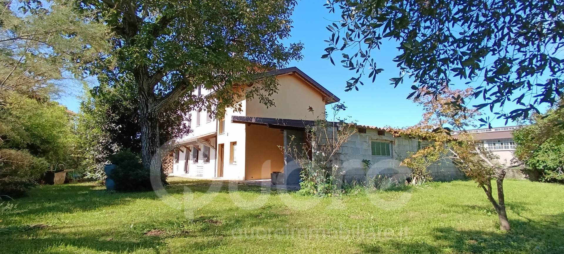 Casa di testa con ampio giardino situata in una zona residenziale molto tranquilla.<br>Piano terra ingresso, cucina abitabile, soggiorno e bagno con lavanderia; adiacente la casa un deposito recentemente ristrutturato su due piani ideale come studio o stanza hobby; ampio porticato uso autorimesse.<br>Piano primo con due camere, ripostiglio e bagno.<br>Piano secondo ampia soffitta travi a vista.<br>Bellissimo giardino recintato e piantumato.
